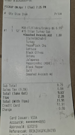 Read moreOkay, this was literally the biggest mess I've ever had to deal with. So I'm a college student who's on a very tight budget and for the first time in a while I decided to treat myself: wrong choice. I mobile order my food around 7:15 and am told it will be ready by 7:35. Cool, that's fine with me. So I get there at 7:30 and they haven't even begun to make my sandwich, and when they tell me it will be a few minutes they then begin making people's sandwiches who WALKED IN AFTER ME. Another guy had a mobile order, and he ended up having to yell at the workers for them to start his sandwich, which they had nothing he wanted. The guy finally leaves, and my mother had to walk and tell them to start making mine because she drove me and was pissed she'd been waiting for over 30 minutes in the car. They finally, FINALLY, start making my sandwich and guess what, ITS WRONG. The bread is wrong and stale, theres no avocado, and it's not even cut in half. I'm literally so pissed do...