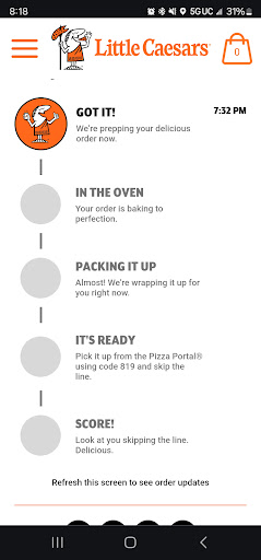 I checked the app again and saw my order was still listed as âin the oven.â I came back later when the app showed it was being packed. A different employee was at the counter this time and told me my cheese sticks had been sitting out cold, not even in the Pizza Portal or heated section, just on the counter. She asked if I wanted them remade â but by that point, it had been over an hour and a half. My hungry daughter couldnât wait any longer, so I asked for a refund.