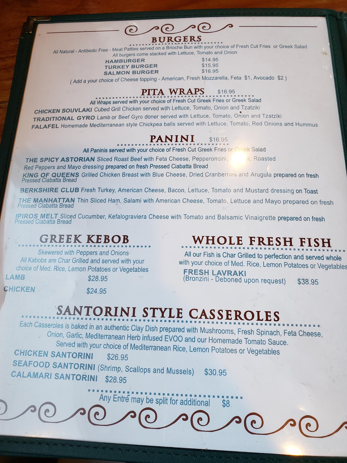 For the main courses, I had the Chicken Souvlaki pita wrap. I was very disappointed with the lack of flavor. Normally the chicken is bursting with flavor from being marinated in Greek spices, but this was very tasteless. Luckily the tzatziki sauce helped provide a little bit of flavor as I tried to finish the pita wrap. It was accompanied by "fresh cut" Greek fries. These were basically nothing more than potato chips, and once again they lacked flavor. At least they were crispy.