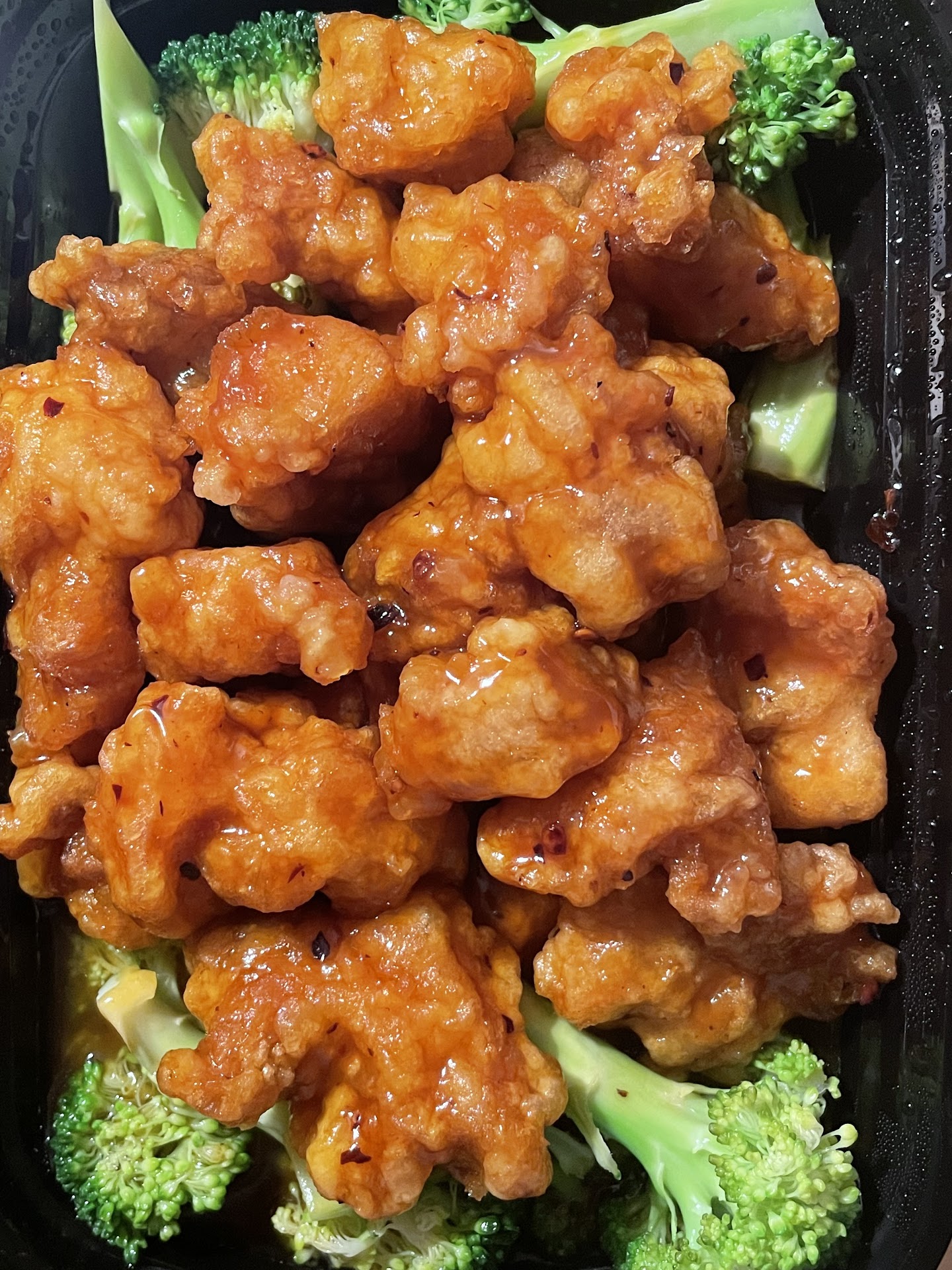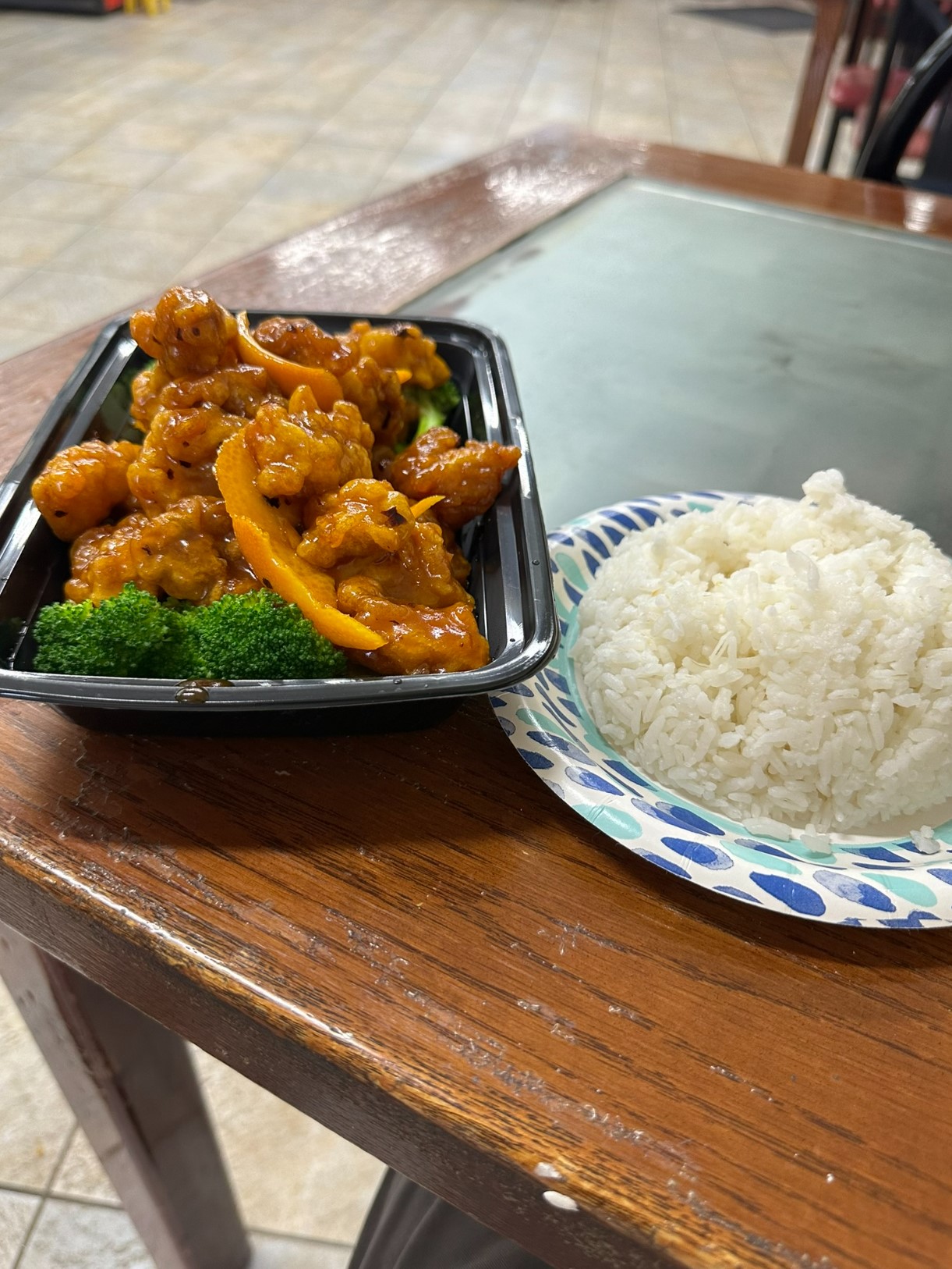 I ordered their tangerine chicken (what I normally call orange chicken) and white rice. Since it's such a small place, the food comes out piping hot. It was delivered to my table before I paid.