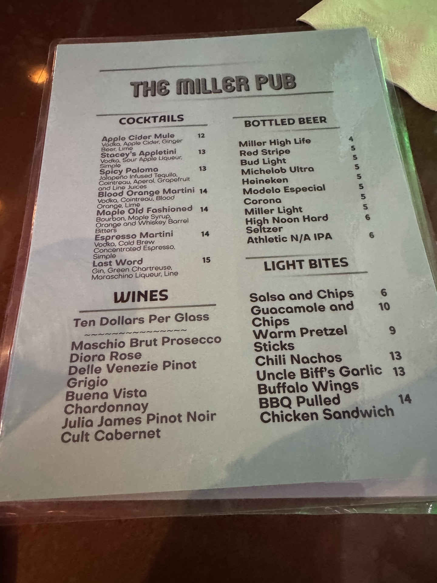 It’s a dive bar so if that’s what you’re looking for, this is your place. My husband and I stopped in for a drink on a Sunday afternoon while we were waiting for an event to start nearby. It was clean and the bartender was quick and friendly. I was surprised to see that all wines on the menu attached are $10 per glass. At some decent restaurants you can get a glass of house wine for $7 so $10 seemed like a lot for basic bar. It was a fine place but likely won’t return if I’m in...