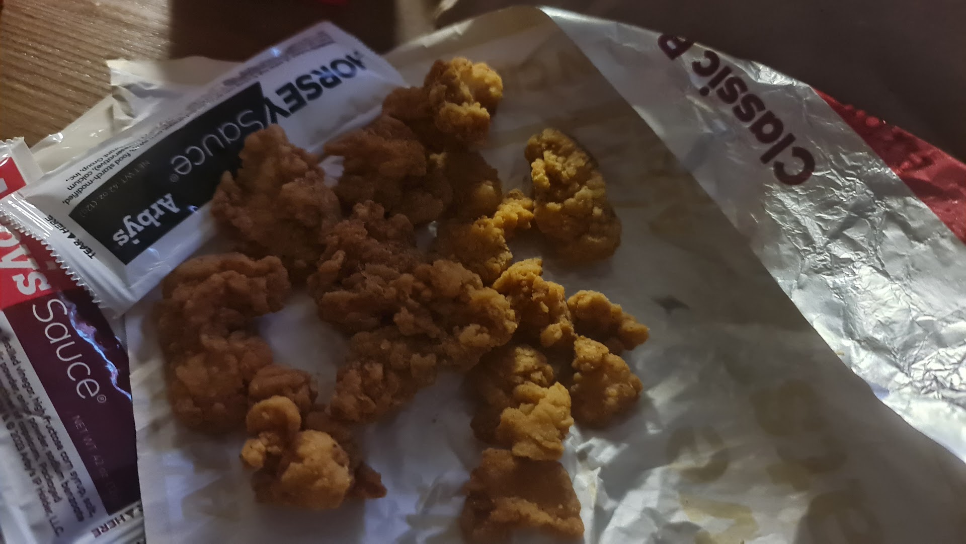 Ordered a few things that were okay but my 6 piece chicken nugget had absolutely no chicken. Just about 15 dime size pieces of fried bits. Literally no chicken just dried out crunch. Normal size sauce packet for reference. This place needs to close. Open another taco bell or McDonald's. At least it's consistent average food with no bad surprises.