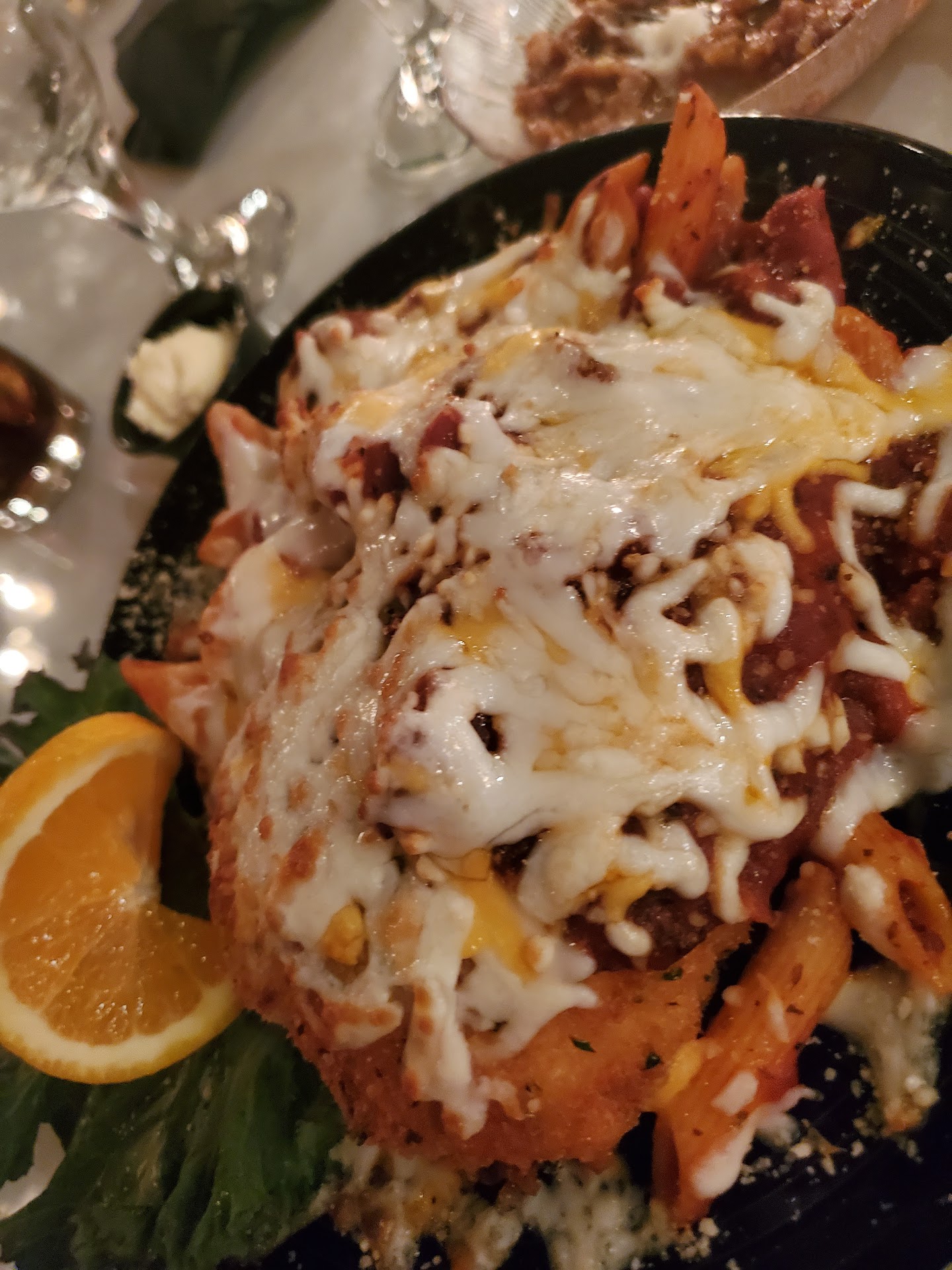 FOOD: Another miss for me. It's not bad, it's just not "fine dining" good. Certainly not $31 a plate good. I was never asked "how's your food" and I'm pretty sure it's because they didn't want any send backs. For just north of $30 I got a dry overcooked chicken breast cut well and tossed with linguine and such a sparing amount of alfredo I had to ask for more. The pasta was cooked to my satisfaction, they got that right. With additional sauce, this was $13 Applebee's quality. Bread was good, there's olive oil and balsamic at your disposal. They brought out a delicious garlic oil which made the bread the best part of the meal. Salad was good, I'd rather have just had that and bread. Seafood alfredo, taste wasn't too bad, the shrimp was overcooked boys! Dessert, pfft come on, you know it was good. Delicious chocolate volcano something-or-other.