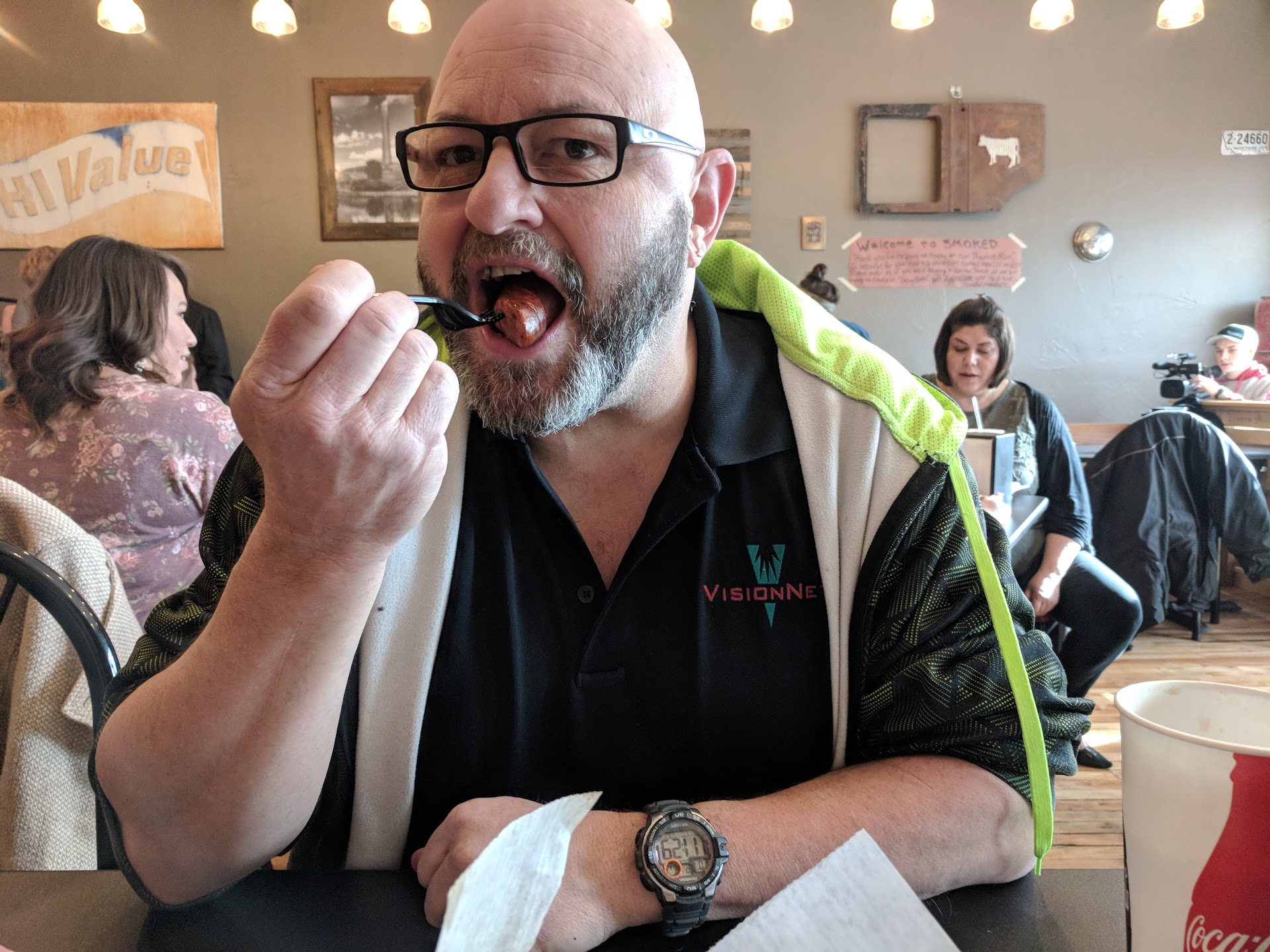Smoked. Wow. 1 sentence review? Best BBQ in town. But if you need detail I'll try. The Bbq joint with the pig in front. If the name doesn't fit this establishment the big PiG in for t will. This has become a local mascot for the bbq joint. A mix of vintage with a new age twist. As the smell lures you in like a finessed fly fishing jig. Open the door. It hits you. Like your cold feet on a weight scale in the morning. Any thought of dieting or lowering calorie intake just left like the mist on dam. If the smells dont hit you the line will. Yes line. Why because this town recognizes great food. And if your not early they sell out. Now where in line just drooling looking at the people around you smiling with bbq mustaches. The atmosphere is joy, confidence, and a satisfying feeling of pride supporting local business. The decorative environment makes it feel homely but modern new age vintage if you will. Rustic signs old doors and reclaimed wood surrounds you. Making the vintage collector jealous. Now it's your turn. Dont think just employees work. No! The owners are there helping serving making sure you no doubt gain a pound or two. Satisfied. Now your greeted with a smile. What are you having? Damn. Got caught up in the atmosphere and smells you forgot to look at the menu which is hand crafted and thoughtfully written on "meat paper" giving you the hometown butcher shop feel. In confusion brisket, pulled pork, links.... uh ribs??? Take a deep breath as for a suggestion. Give me the special. Pig Mac. No processed nuggets here my friends. He open the heated fridge Md slabs on meat by the pound. Do t forget the sides. Can't help you there. Toss a 3 sided coin. Coleslaw, beans, Mac n cheese. Your choice. Paid. Now we sit and devour. Right? Wrong! Sauces. Does this delicious meal need the sauces? Heck No! But why not. The few they have there are carefully crafted by the pigs o. Heaven. A mild heat with a thick squeeze. Or a tangy vinaigrette with enough flavor to drink out of it with a straw. Chicken? They got your flavored sauce. No you dont have to peel it back like a cheap sweet n sour dip at Mc D's. Num..num.. Take it slow enjoy the flavor. Enjoy the deep rings and not talking about the nugget on your ring finger I'm talking about the smoke rings of pureness. Deep flavor. Hopefully this review helps you to try this amazing local establishment but I'm hungry and have to eat I only get 1 hour for lunch and I'm debating on seconds. Enjoy you wont be...