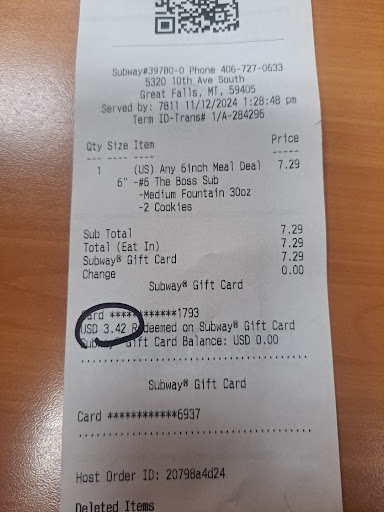 Read more11/12/2024 1:25 pm two women were working. Sandwich was prepared quickly. Didn't receive a napkin. Marinara meatball sandwiches can be a bit messy. Napkin dispenser next to the soda dispenser was completely empty.