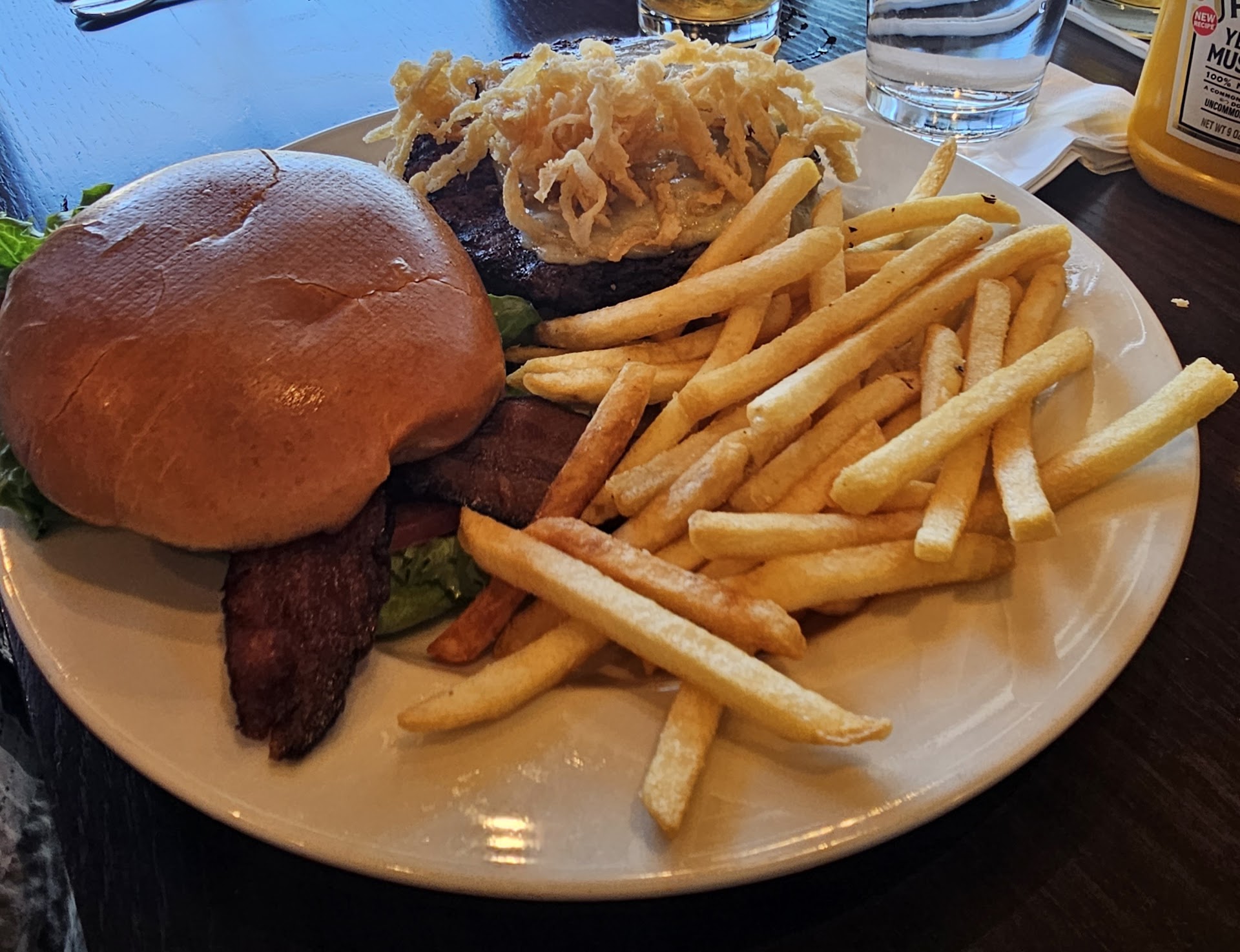 For my main courses I ordered the Bison Burger which was simple but phenomenal. Fantastically seasoned bison patty with white cheddar, crisp onion straws, lettuce, tomato, onions and pickles. I asked for mid-rare and it came out exactly medium however, it was not over cooked. The bison patty was moist and tender while maintaining a fantastic flavor. This was accompanied by the seasonal vegetables that were sauteed in a pan and were amazingly delightful. Butternut squash and snow peas.
