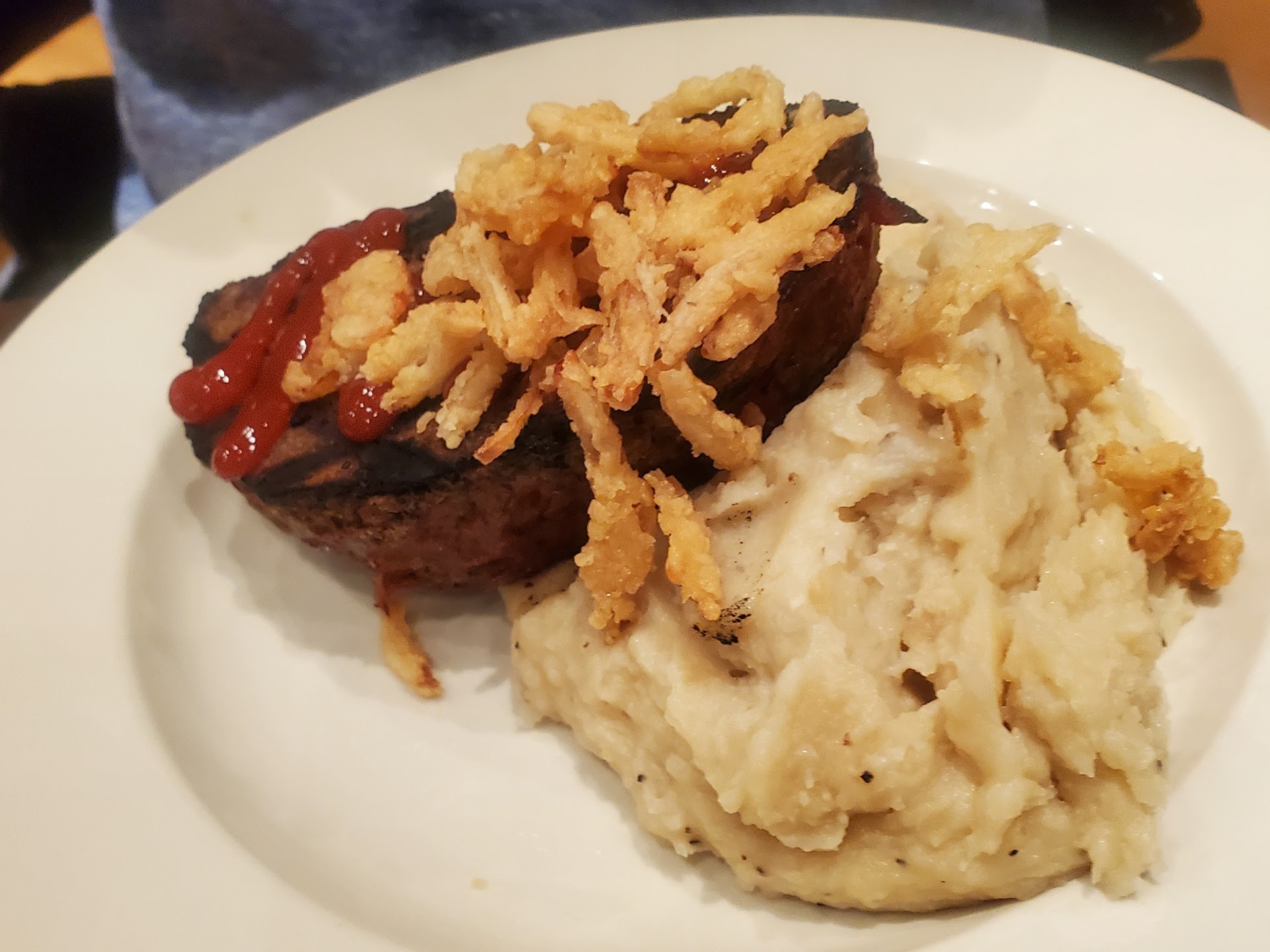 Rotisserie sirloin was chewy and bland, and the garlic mashed potatoes were very bland.