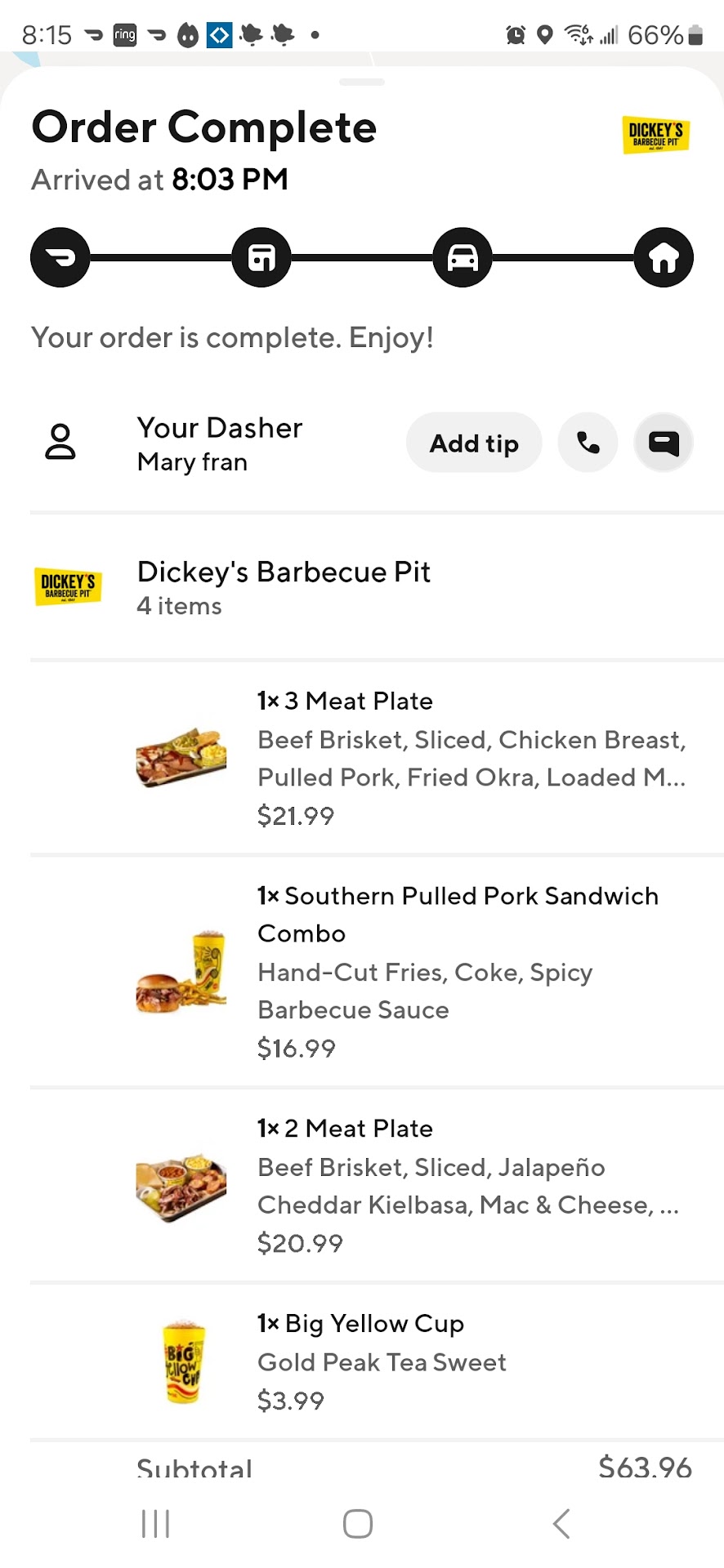 I’ve worked at a Dickeys restaurant for two years. The item that takes longest to prepare is chicken tenders, at 5-6 minutes in the fryer. When I went in today to pick up an order, the restaurant had no line and was completely empty except for a couple who were already eating. The three workers I could see hadn’t even begun making the order, so it would stay fresh, and that’s fine. However, an order of two sandwiches, two already prepared sides (non fried), and a few chicken tenders taking three workers more than 20 minutes to prepare is not fine. That is outrageous. At longest, it should have taken 10 minutes, and even that is crazy for a completely empty restaurant and three people. Even worse, after leaving the restaurant, I found out they got the order wrong. Horrible experience, and I will not be returning to...