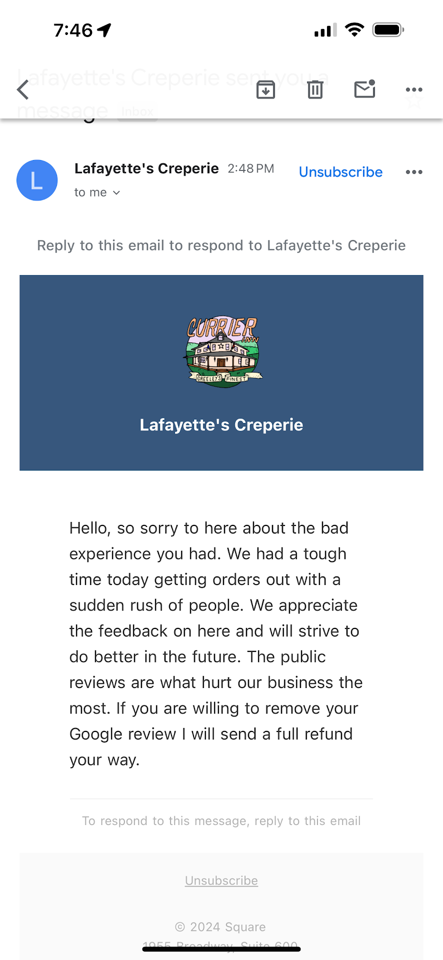 We showed up to the Lafayette Creperie at 11am. We were seated, asked if we wanted water and tried to order coffee. The staff member told us to wait for her to take another tables order (understandable) although there was only two other tables. We then ordered our coffee and our food at the same time after patiently waiting. The chai latte arrived cold after waiting an extensive amount of time, so we had to ask them to remake it. They were happy to do so and it came out quickly and at a good temp. Then we waited over an hour for two crepes, we had to go inside and ask if they were going to bring our food before it came out. When we got it, they were cold and mushy. Overall the service was kind but very subpar at best and they were kind enough to take our coffees off our bill but when we asked to pay they said we have to go up front and pay with another staff member. I asked for a receipt and they told me they couldnât give me one. We left feeling very letdown and will not return in the future or recommend to others. EDIT: This company asked me to take down my review in return for a full refund. I believe that is the only reason they have the...
