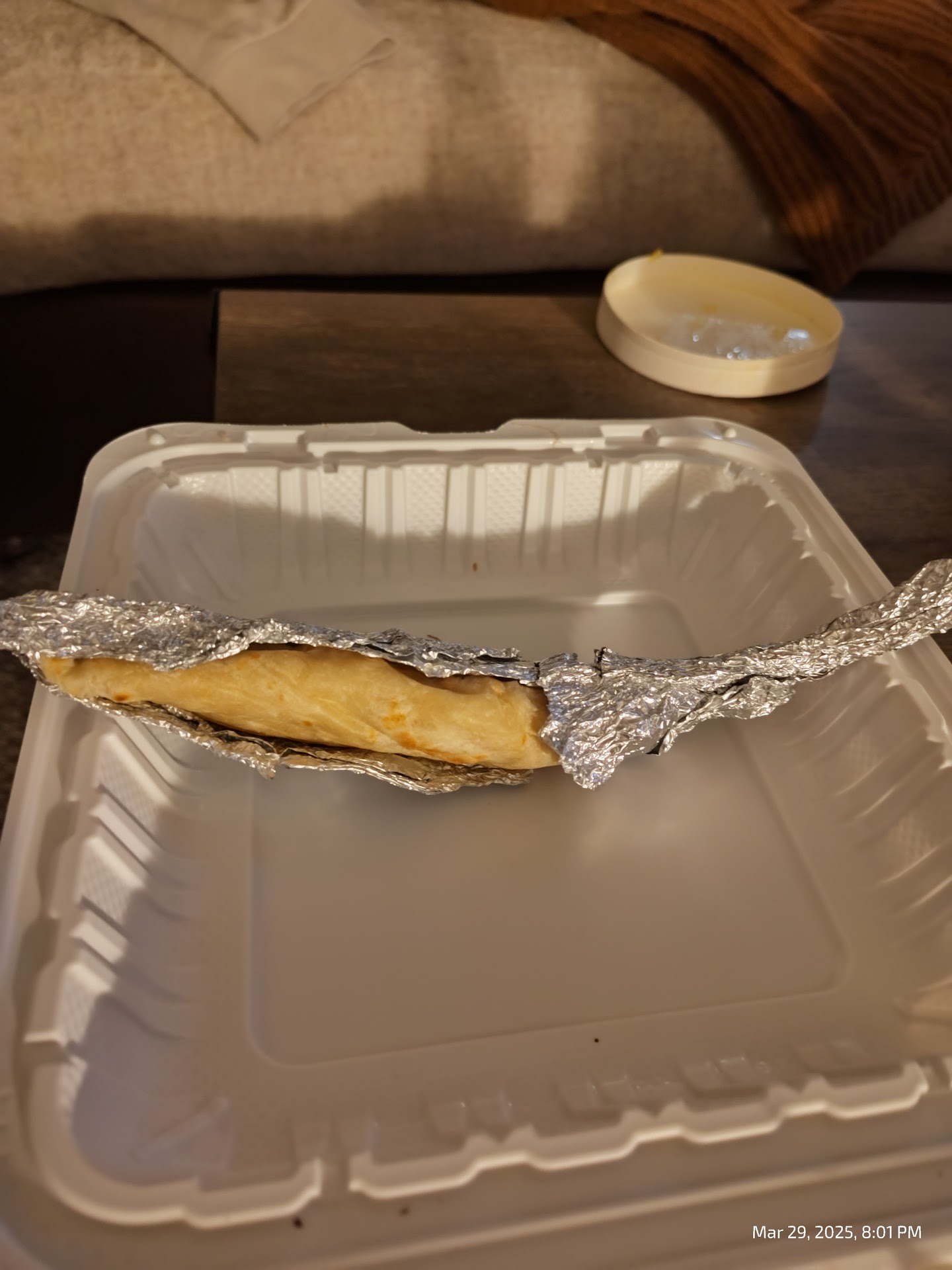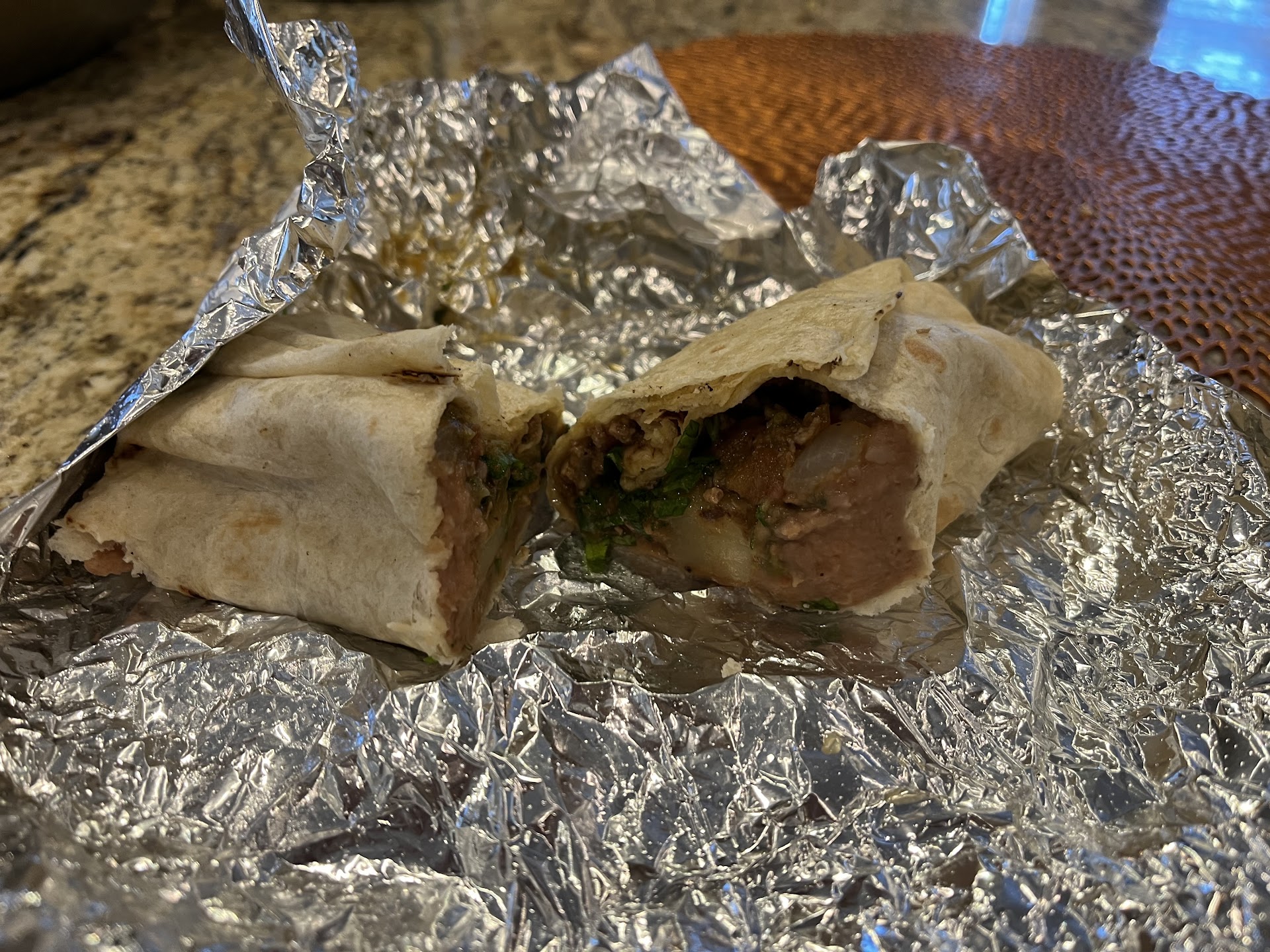 My wife got the smothered carnitas burrito with 1/2 green 1/2 red sauce. It large and very delicious. It came with a side of rice that was also good.