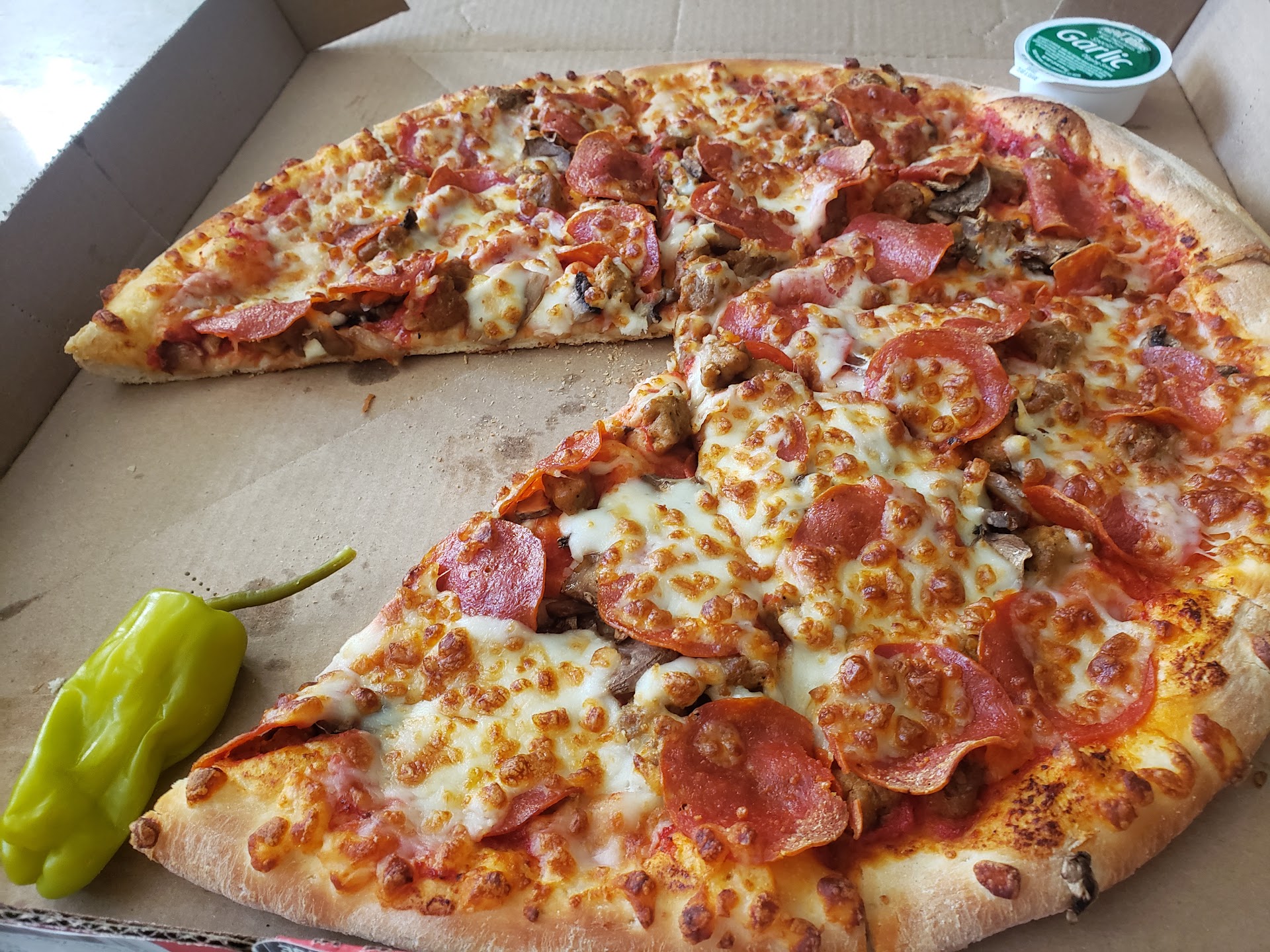 Very disappointed with this delivery order. For starters, we wanted to try out the NY style pizza (we both lived in the tri-state area and wanted to see how PJ measured up), but we received what seems like a regular pan pizza. It wasn't thin enough a crust and did not fold... but there's another potential reason for that: our pizza was left on the door step without a knock or doorbell ring (which i specified in the notes); we have a dog that didn't even look up or do his usual alert when someone approaches the door. The pizza sat on our doormat long enough to get cold, for the cheese to be stiff, and the garlic sauce became more solidified.