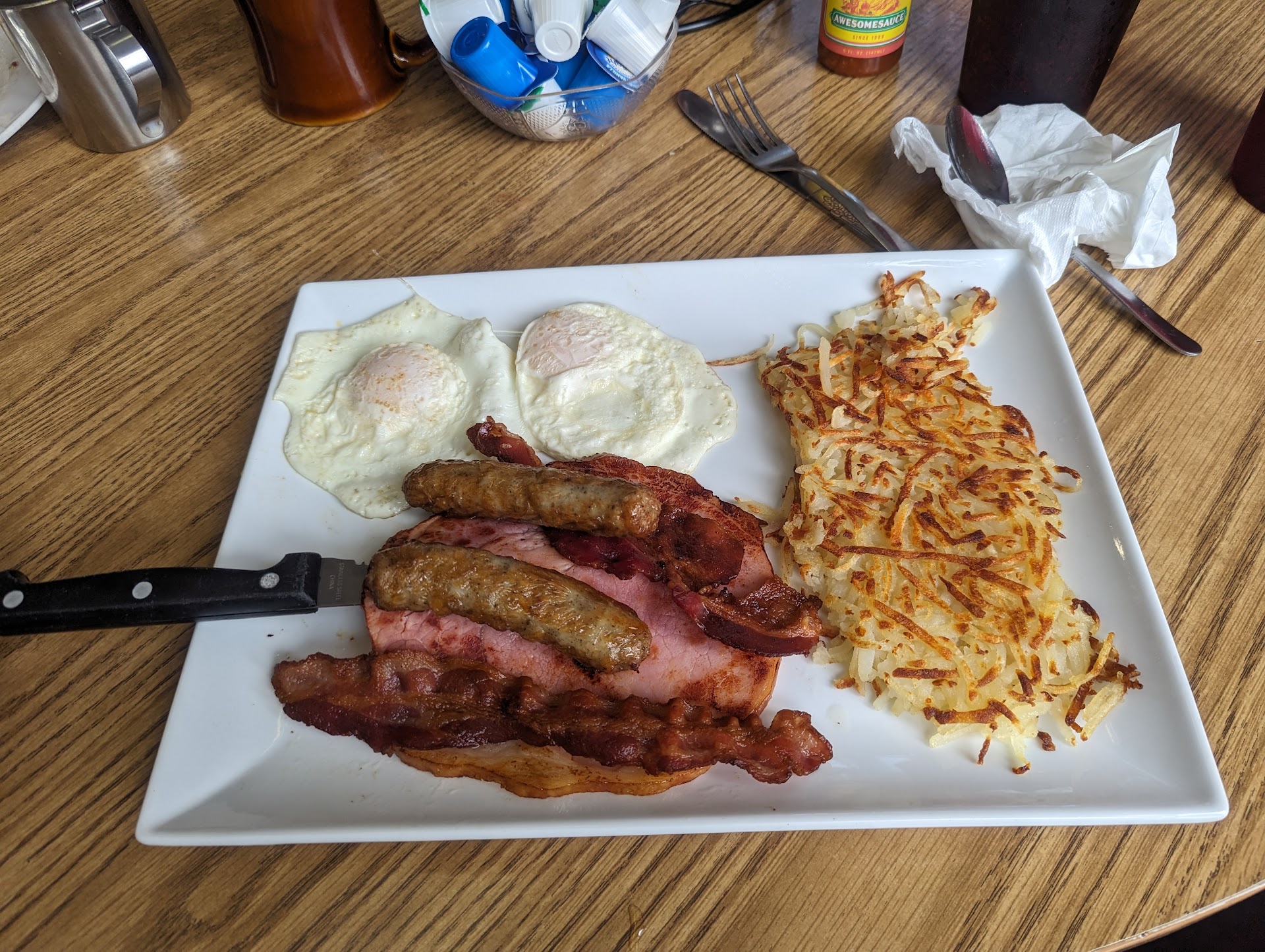 The Food - No sooner than I placed my order than it seemed to come out of the kitchen. Eggs were cooked to perfection and the bacon was crispy and not burnt! And the final touch? Tabasco Sauce on every table!!