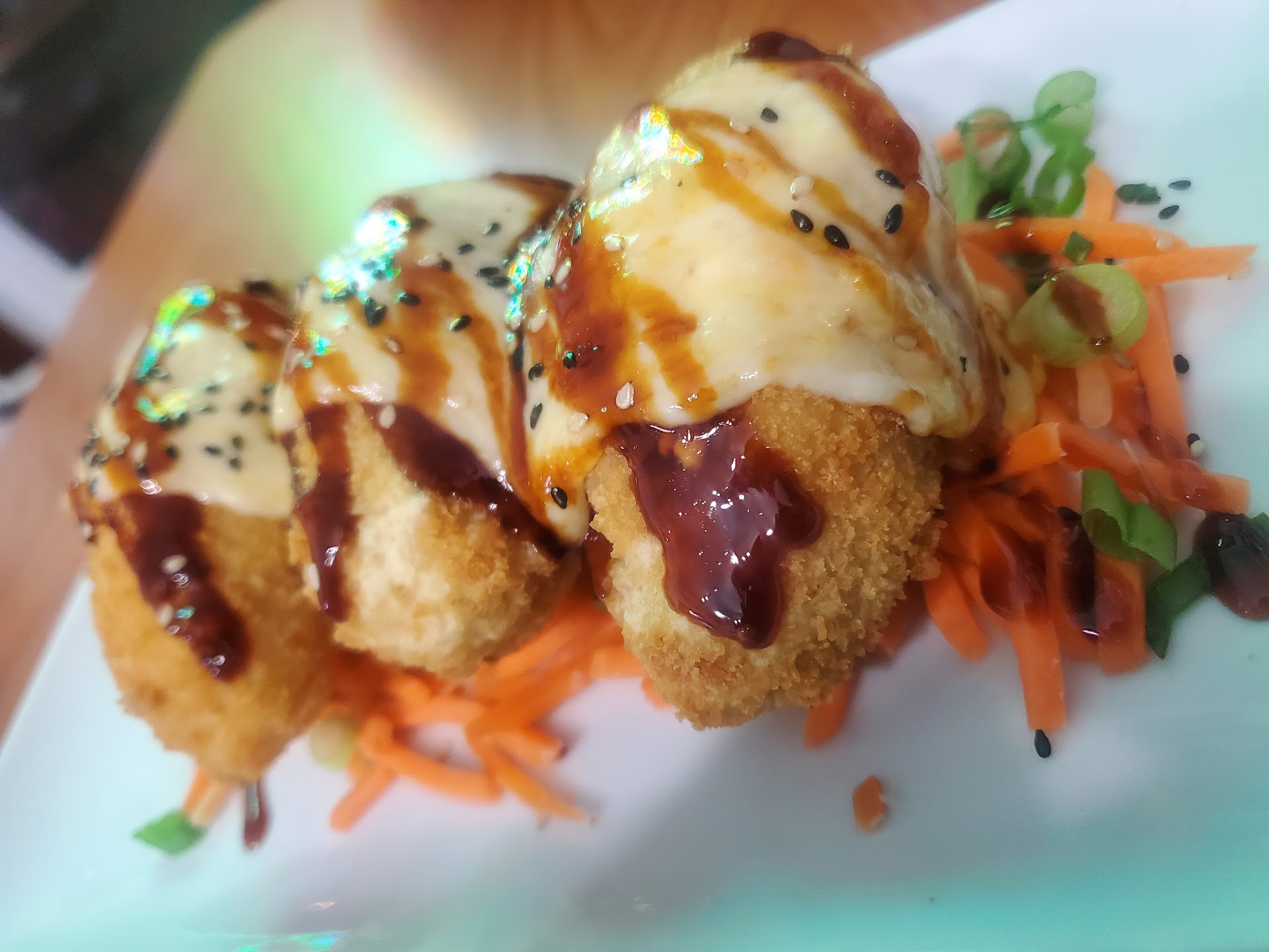 Next we ordered one of the house special "BOMBS"...it had a bacon sauce/cheese or something on top (good), and theinside had a bit of everything....chicken, steak, shrimp, sushi rice, nori, and again a huge bit of cream cheese...