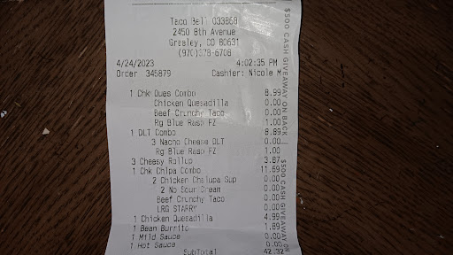 1st time there, for the "Rockies Taco Special." This was the only time EVER that I was the only one in the drive-through! Response was quick, and very friendly. No pushing to buy anything else than the special ($2 for 4 crunchy tacos). The tacos were hot, crunchy shells, and twice the amount of meat than at any other Taco Bell I've EVER been to. Make sure to ask for your sauce, and extra napkins, because the kids that work there sometimes forget to ask. This Taco Bell is highly recommended.