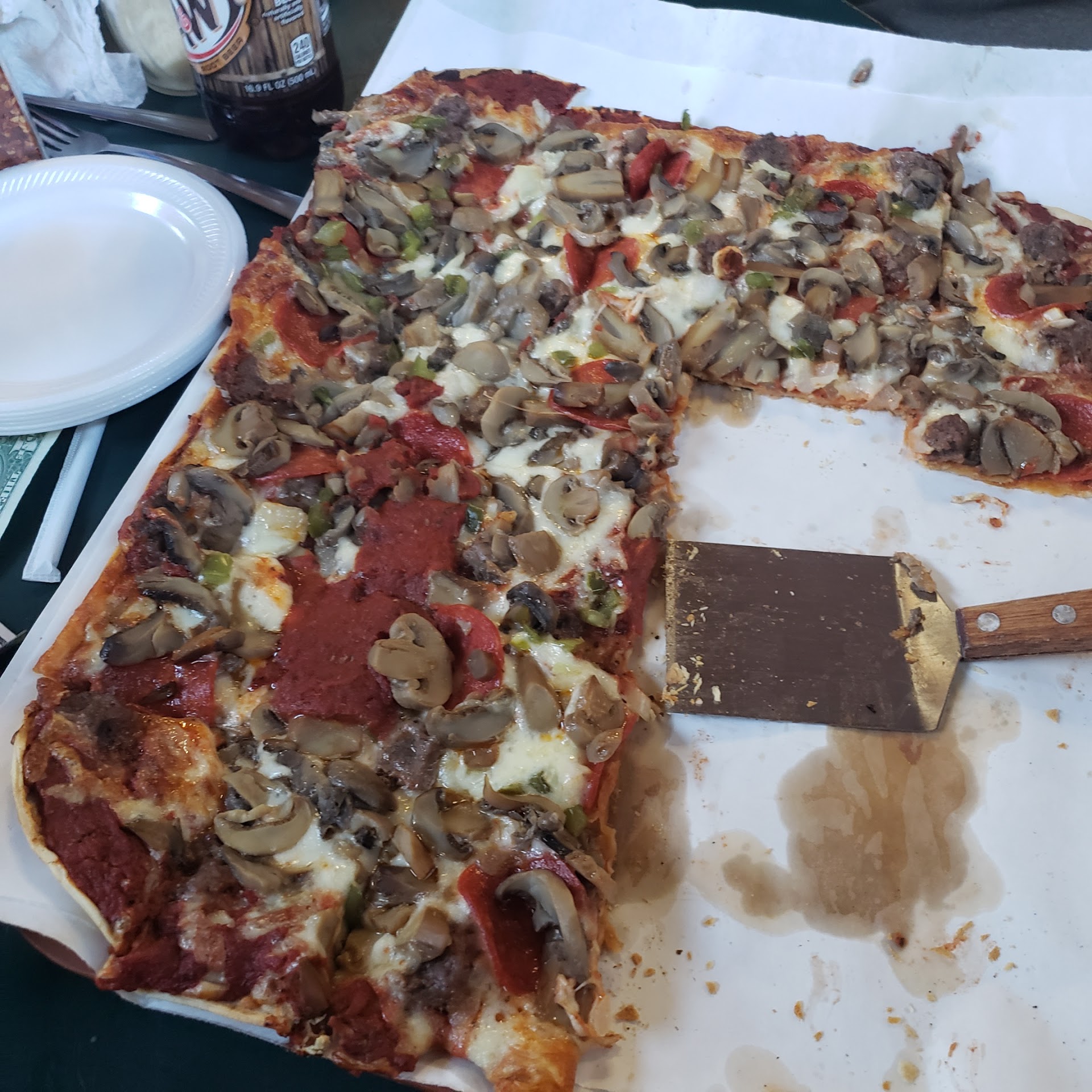 Read moreThe pizza crust was crisp but that was the only thing that was remotely good. The burgers tasted like fish, they dumped a huge can of mushrooms on the pizza, the sausage was just ground beef with pepper. Worst of all if you order delivery you will never see how disgusting the restaurant is. So dirty to the point were you are almost afraid to sit down. The spiders webs on everything was really creepy. The ceiling is caving in, the decor is outdated and the restaurant is over packed with...