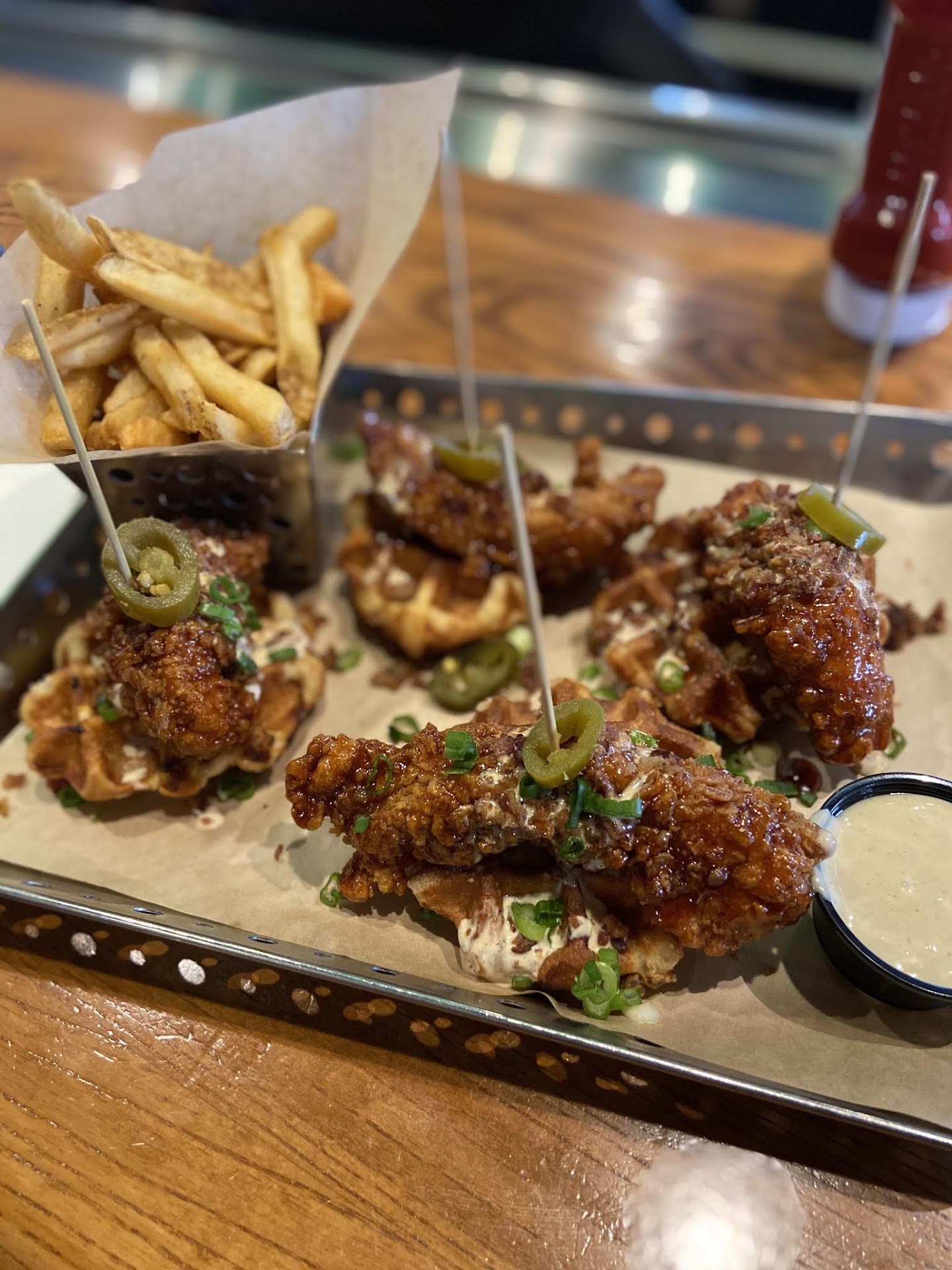 We both ordered the Honey-Chipotle Crispers® & Waffles. This included crispers on top of Belgian waffles. Topped with bacon, jalapeños, ancho-chile ranch. Served with fries & honey-chipotle sauce. The serving was generous, I only ate half. My fiancé ate his whole plate. The French fries were cold when they arrived, so we didn't eat them. The crispers were nice, crunchy but had sauce on them. They had fresh green onions on top, which was a weird flavor with the waffle combo. The waffles were not good, they were dry and hard. Instead of syrup, there was this hard burnt brown sugar like crust on some of the pieces, which wasn't good. There was supposed to be ancho-chile ranch on the meal, but it was only a few drops here an there. I wish I would have asked for it on the side.