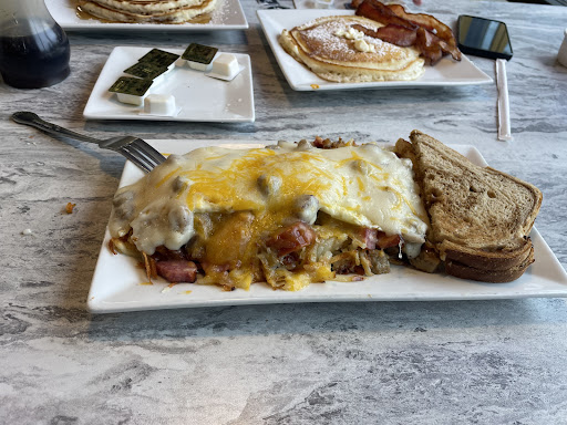 Read more11/5/23 we went for breakfast for the first time. I’ve been wanting to stop here since Egg Yolk got there. When we got there we had to wait just a little bit for them to clear a table since they were busy no big deal at all. We sat down and they took our drink order. I got coffee and water the wife got a soda. They have a really good sized menu for breakfast lots to choose from. I was originally going to order biscuits and gravy but then I seen their carnivores skillet. I ordered the skillet with eggs over easy and covered with sausage gravy and crispy hash browns with Rye toast. The wife ordered 2 pancakes and bacon. It did take a bit to get our food but it was Sunday and just after church time so it’s gonna be busy. When our food came the first impression was wow that looks delicious. I started with the toast cause cold toast is no good lol. Upon my first bit of the skillet I was in heaven. So if I remember correctly it has sausage, ham, bacon a nd polish sausage. The polish sausage give it a great flavor. The wife’s pancakes were delicious also the edges had little crispy ends and they were fluffy. My only critique would be is that the waitress we had would have been a little more attentive. She seemed to be more interested in her phone instead of asking if we needed anything or bringing us our check. We waited for a while for the check and I just walked up to the counter where she was and asked to pay. I would definitely...