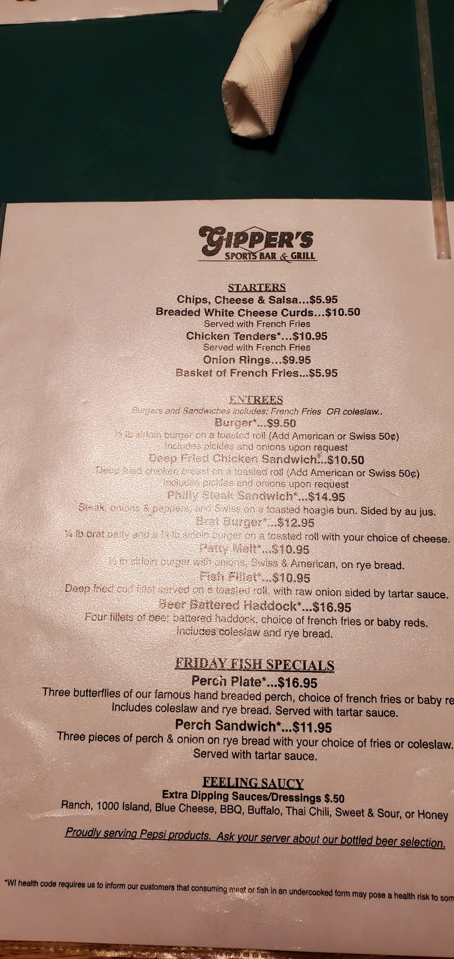 Terrible Food! Terrible Waitress! There are not many choices on the east side of Green Bay, Gipper's being one of them. We have not had good luck with food or service in the past so took a break from going to Gipper's for about a year. Finally talked my 16 yr old son into giving Gipper's a try. WHAT A MISTAKE! We ordered potatoe skins and 2 ceasar salads and it took over 45 minutes to receive our order, we were one of 4 tables in the place. When we did receive our food the chicken on my son's salad was RAW and potato skins were so over cooked they were porous rocks. Waitress took raw chicken ceasar salad back to kitchen. Returned with a message from the "cook" that it was a blood line in the chicken and he would make me another one. Folks... that was no blood line. The top 1 inch of the breast was RAW. When the waitress brought back the salad with the same chicken that had been recooked!!!!!!!! I thanked her for her service. Told her I completely understand it was not her fault. She informed me next time I better just keep my mouth shut instead of yelling at the waitress because it really is not her fault! Nice. The owner took the salad off my bill. thanks for that. did not even touch the second one that was served. all in all really bad experience. SAVE YOUR MONEY FOLKS.There are not many choices on the east side of Green Bay, Gipper's being one of them. We have not had good luck with food or service in the past so took a break from going to Gipper's for about a year. Finally talked my 16 yr old son into giving Gipper's a try. WHAT A MISTAKE! We ordered potatoe skins and 2 ceasar salads and it took over 45 minutes to receive our order, we were one of 4 tables in the place. When we did receive our food the chicken on my son's salad was RAW and potato skins were so over cooked they were porous rocks. Waitress took raw chicken ceasar salad back to kitchen. Returned with a message from the "cook" that it was a blood line in the chicken and he would made me another one. Folks... that was no blood line. The top 1 inch of the breast was RAW. When the waitress brought back the salad with the same chicken that had been recooked!!!!!!!! I thanked her for her service. Told her I completely understand it was not her fault. She informed me next time I better just keep my mouth shut instead of yelling at the waitress because it really is not her fault! Nice. The owner took the salad off my bill. thanks for that. did not even touch the second one that was served. all in all really bad experience. SAVE YOUR...
