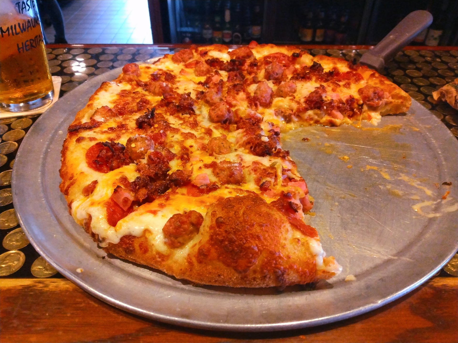 Read moreThis was my first time here, being that I’m not from Green Bay (I do visit often as the friends that I went with live in the Green Bay area). I was in town for a Packer game and after the game we stopped at The Glass Nickel. When we first tried to order our drinks, they were out of just about everything we wanted…. Miller lite, bud light, captain Morgan, etc. We didn’t get our drinks for almost 45 minutes (yes, we timed it) and it was not very busy. My friend had to go up to the bar in order for us to get our drinks. The server had explained that her and the bartenders were the only ones on the floor (which we absolutely know that is not their fault and we were as patient as possible). But considering there were not many people there it still seemed like the whole setup was a mess. After getting our first round of drinks it probably took ANOTHER 45 minutes to get our first pizza and a plate of pasta. Then maybe 20 minutes later our other pizza came. Throughout this whole interaction, the table behind us (who was seated before us) hadn’t received their order (which was only one large pizza) until we were ready to leave. I would say there were probably around 20 people or less here at the time. Once we finally finished eating, our bill was way wrong. We were overcharged for things that we had never even received. The server said she gave us a discount after but there was NO DISCOUNT 🥴 the food was good!!! Service needs work all the way around. Server was friendly but there needs to be better systems in place and a bigger staff. ESPECIALLY...