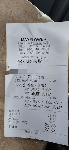 Mayflower use to be the only Chinese restaurant in Green Bay so by default it was the best … things have definitely changed I’d put the food i just paid for and ate below Panda Express and Panda Express is disgusting itself . My Honest opinion of my dinner tonight is crap,...
