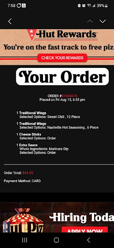 Ordered 1 pizza and Bread sticks the other day at 5:45pm they never delivered the food or answered the telephone so we gave up around 9pm (lol wow that’s a first). They next day around 4pm I figured I better just physically go to Pizza Hut myself because I knew they weren’t coming to me.