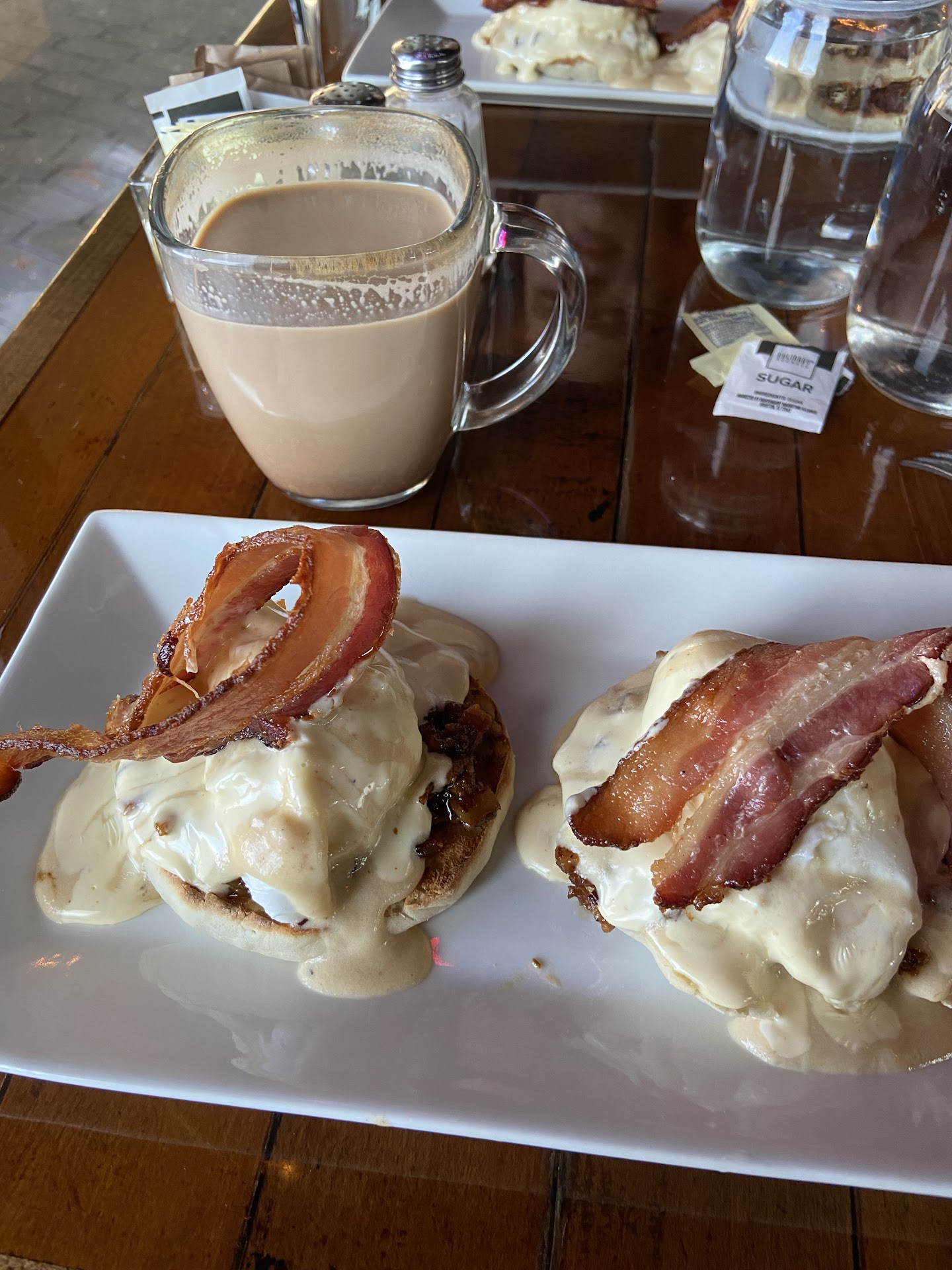 My friend ordered a pineapple mimosa and I ordered a cafe mocha. I usually order a mocha wherever I go, so I am used to drinking them. For some reason, mine tasted like there was zero sugar in it, so I had to add some. We both ordered the Town Drunk egg benedict which was poached eggs, an english muffin, bacon jam, beer cheese, hollandaise sauce and bacon strips on top. The dish had some high and low points. The bacon on top was very good, good thickness cut, done correctly and good flavor. The hollandaise sauce was just ok, kind of bland. One of my issues was with the poached eggs. One of my eggs - a portion of the egg white wasn't fully done, so I couldn't eat that part. The bacon jam underneath the eggs was so think and overly salty and sweet, I think they should tweak this. It also made the muffin underneath super soggy, which it not being toasted also caused that issue.