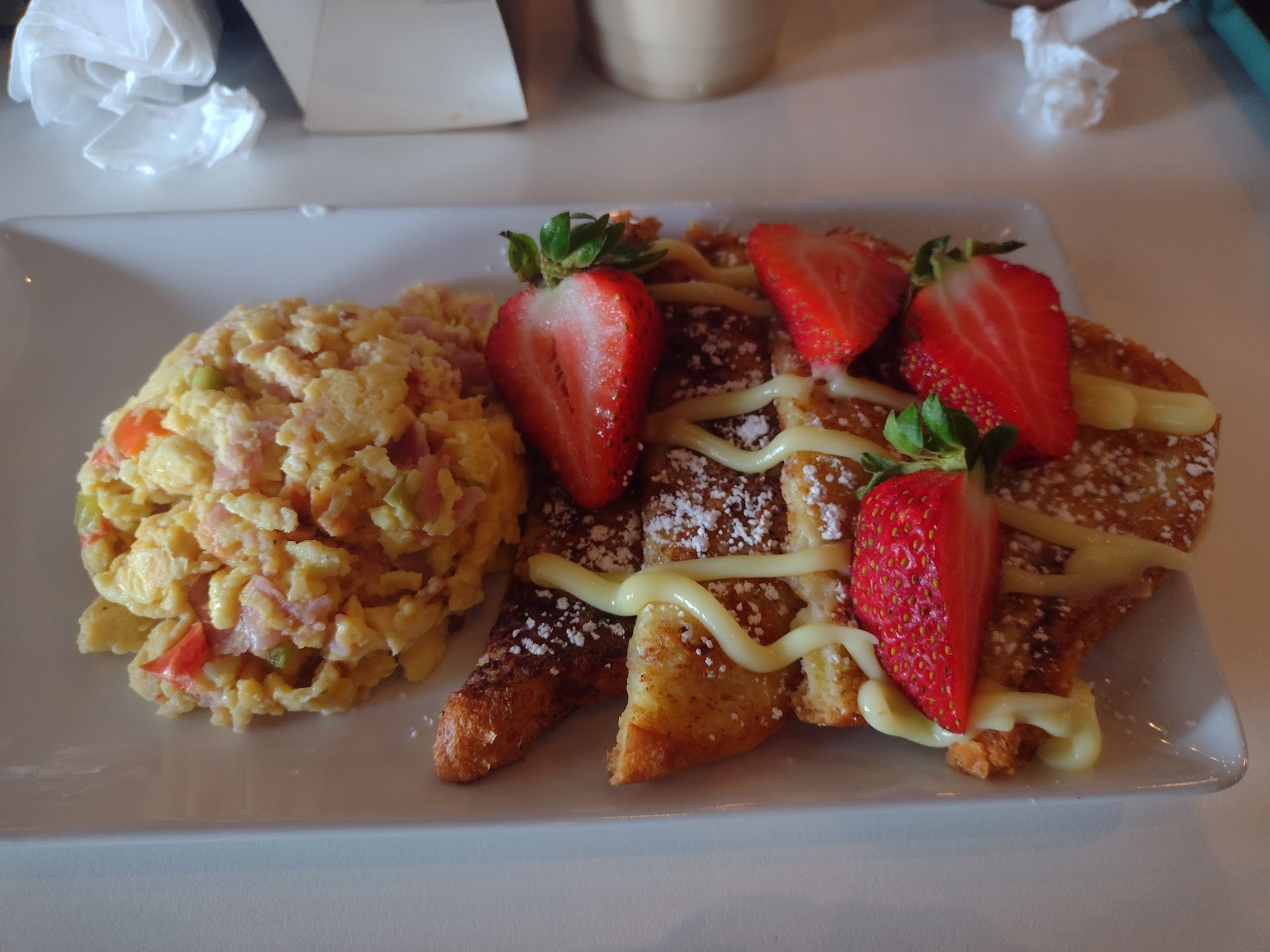 Drinks were good. Food was too but, I ordered an omelette and got scrambled eggs and french toast?? Everyone else got what they ordered. The orders came out a bit choppy. What I mean is one order came to the table, then the second came out a few minutes later, then the third and fourth came out together. People where done eating by the time three and four got their meals. So going whit a group of more then two people may not be the best idea here. I saw two people working so that may be an issue. Not enough help? But then again I don't know how busy or not, they are so it may not be wise to have staff of more then two?? All I can say is "been there". Give it a try. The food was good. Just have the time to enjoy. Oh the atmosphere. Well. I thought the movie selection they had playing on the TV was a bit disturbing, and hard to watch while eating. Even my daughter said don't watch the movie mom. Ya not asking for a kids movie but something that may not cause you to not want to eat, because the movie is hard to look at while trying to eat. For me anyway. I am sure others could eat through bodies exploring??? Not me, eyes on the plate. Give it a go. You will like the food and drink. First picture is the omelette. What they call...