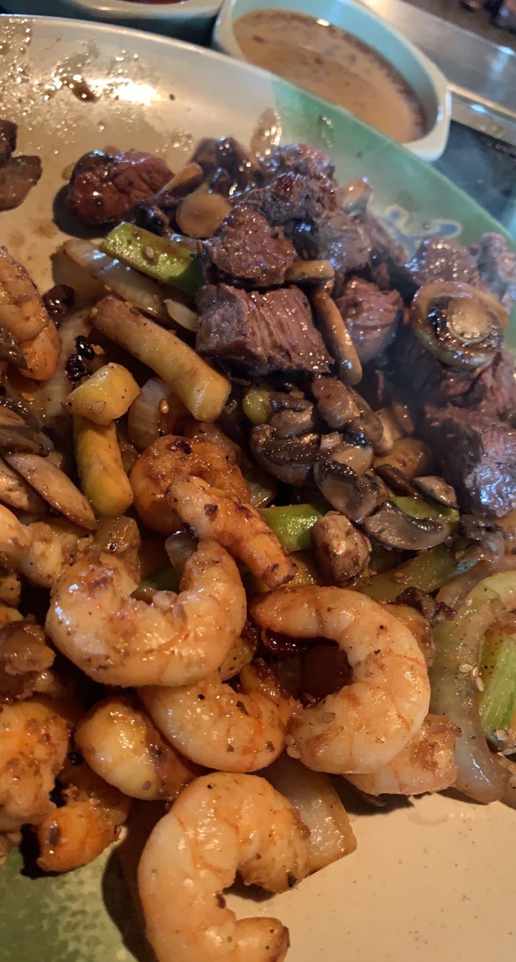 We all ordered and the other party ordered shrimp and my husband is allergic to shrimp. We let the waitress know about his food allergy and she let out a huge sigh and said she would ask the chef how he would like to handle it. She really didn't know how to handle the food allergy. When she returned she said the chef said it shouldn't be a problem. Long and short of it....my husband couldn't eat because the chef cross contaminated the food with the shrimp. He kept wiping the spatula on the same towl he wiped the shrimp on. He also cooked everything one at a time so he cooked the vegetables and passed them out, then cooked the rice, passed ot out, and then the meat. By the time you had the full meal on your plate it was cold.