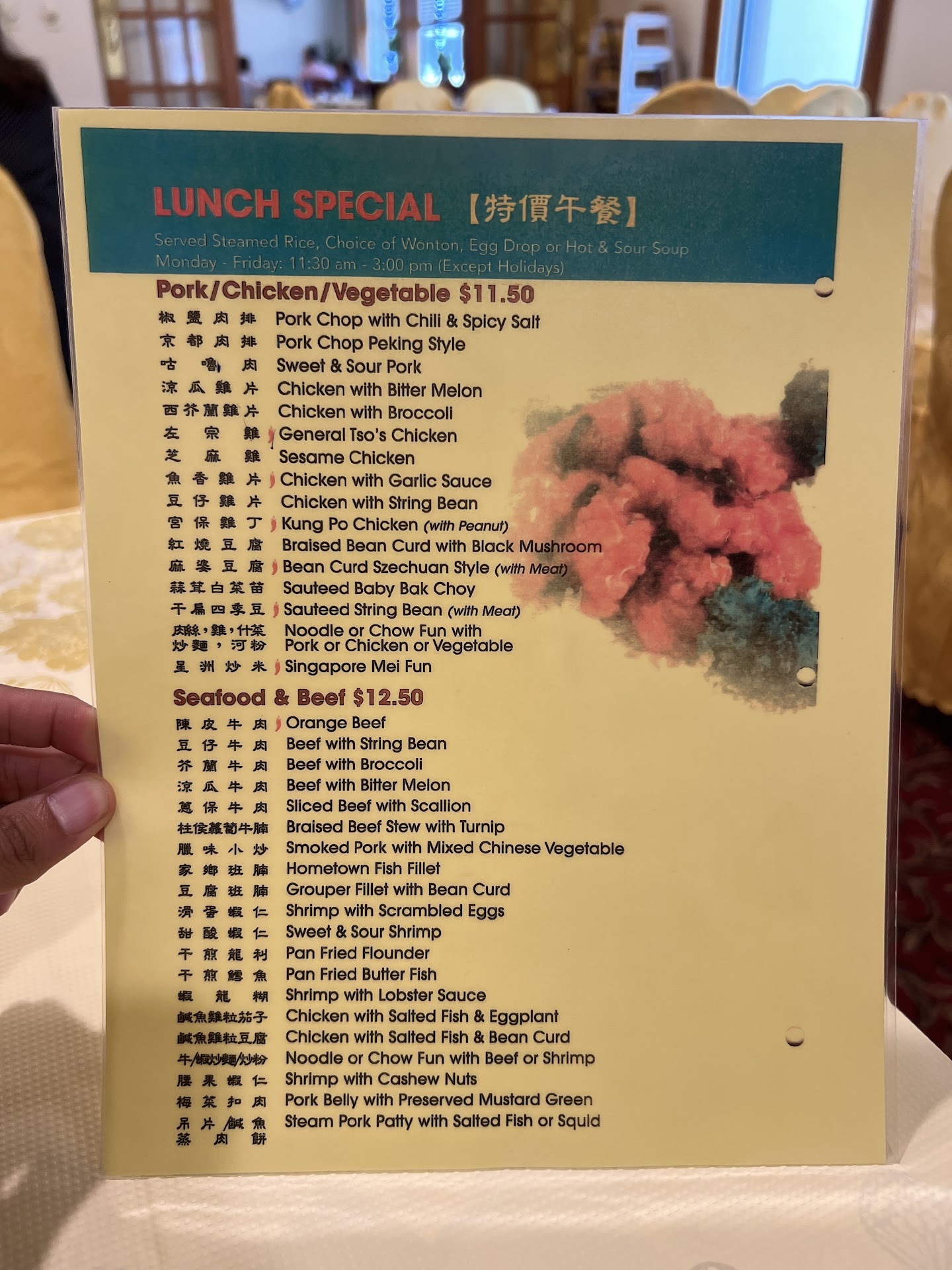 Very disappointing. Nice large restaurant, good lighting, new chairs and tables. We were the first people for lunch that day and were seated next to a window, 30 seconds later the maître d' sat three people at the next table, so close that I could feel her chair on my chair. Incredible seating, given we were the only ones in the restaurant. I asked to have another table, and was looked at as if I were crazy. We ordered two dim sum and they were both fine and reasonably priced. We had two lunch specials. Both the hot and sour soup and wonton soup were terrific. The was double cooked pork had so much white pepper that I could hardly eat it. Not much pork and a few vegetables. My partner had the shrimp with garlic sauce, the shrimp was prepared nicely, but the dish had little flavor. I figured I would give them one more chance and ordered a dinner take-out portion of eggplant in garlic sauce. I tipped 30%, smiled and left. At home I opened the eggplant dish and saw just a thick brown gravy and pieces of mushy things that I could not recognize. I Just had the same dish at Capitol Seafood in Arcadia, California prepared exquisitely and also had it many times at Chengdu Palace where was almost as good as the Capitol Seafood version. One of my favorite dishes and it was just horrible. If you cannot make a dish maybe it should not be on the menu. I hope things get better, I will be back, (cannot stay away from Chinese restaurants;). Although I am not a big fan of Szechwan style cooking, but Chengdu Palace is down the street, where the food is great, expertly prepared, larger portions, and smiling service people and there are many Cantonese selections to choose from. I mark too easy, I usually give, 5 stars. 3 is the most I can give Green Lake Seafood...