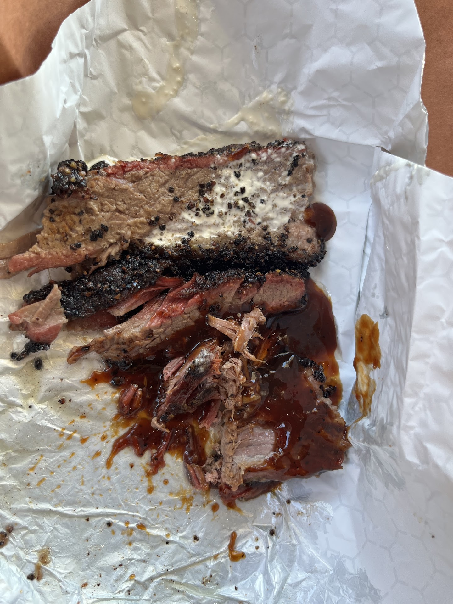 As soon as I opened the wrapped order of brisket I was hit with the sweet aroma of perfectly barbecued meat. I was so excited about tasting the brisket that I dove right in before taking a picture; hence, the photos of the meat slather in sauce and already eaten. The brisket was a perfect medium rare with the right seasoning, char, meat, and fat ratio.