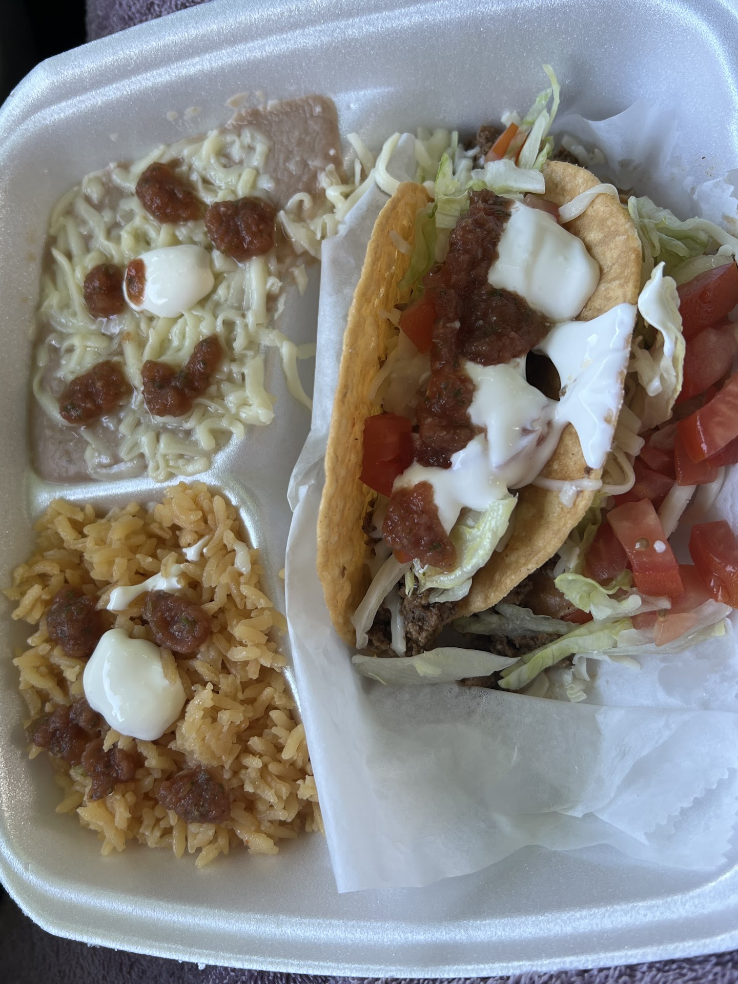 I got the ground beef taco lunch. Come w beans and rice. Taco shells are the store bought kind (v shape) w a little lettuce, tomato and cheese. Also came w an orangeish sauce? It was a little spicy but neither here or there. The rice was very basic but had decent flavor. The beans where a little runny but i mixed the rice in. They were decent as well. Nothing special for $7.99 (two tacos, rice and beans). Have her a $10 bill and she offered no change? So, i left it as a tip. No dine in available. From ordering at door it only took 6 min to get food. Considering everything is already pre made, that was accurate timing. Not great but not...