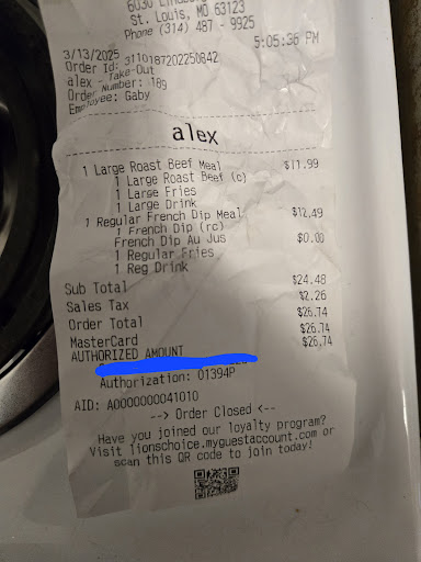 Read moreHonestly extremely disappointed usually this place is great and I have never ever had an issue however today was much different. Everything went well with the order up until I arrived home and saw it was not entirely what I ordered. While the French dip was there the roast beef had been mistakenly switched with a hot dog. Obviously this is not the biggest issue. However I then tried to call to resolve the matter and possibly see about swinging by later this evening to get a decent sandwich but the phone number on the recipet was automated. Telling me to press one to speak to a member of staff. When I did it kept looping and looping and looping. I've never been disappointed and honestly hoped the hotdog might be edible however it was like trying to rip into beef jerky(obviously not what I ordered anyways but still went for it as I was extremely hungry) I would love to come back but I am just disappointed that there is no way to resolve this without driving back. It would be nice to at least call...