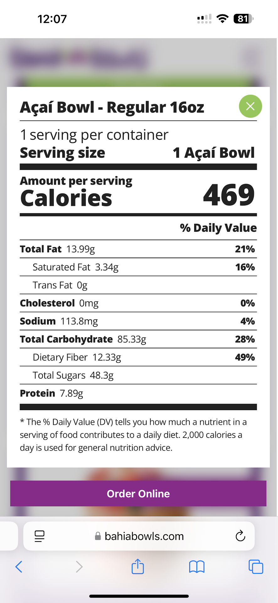 Read moreSo I went to Bahia Bowls today because I thought that it would be a good healthy option as the brand advertises. The bowl itself was a little bit icy, but from what I understand, açai bowls are supposed to be thick and creamy not overly icy. However, it was very good. The employee was very sweet and nice, although when we walked up, the sign said they were closed. The main problem that I have, is that these bowls are not healthy for you AT ALL. In addition, they are 10.95 for a regular size! I feel bad for all of the women especially, that probably eat these thinking that they are healthy. In reality they are a carb bomb and loaded with a ton of sugar. 85g of carbs and 48 of those are sugar! This is dessert, not a healthy quick option for lunch. I attached the...