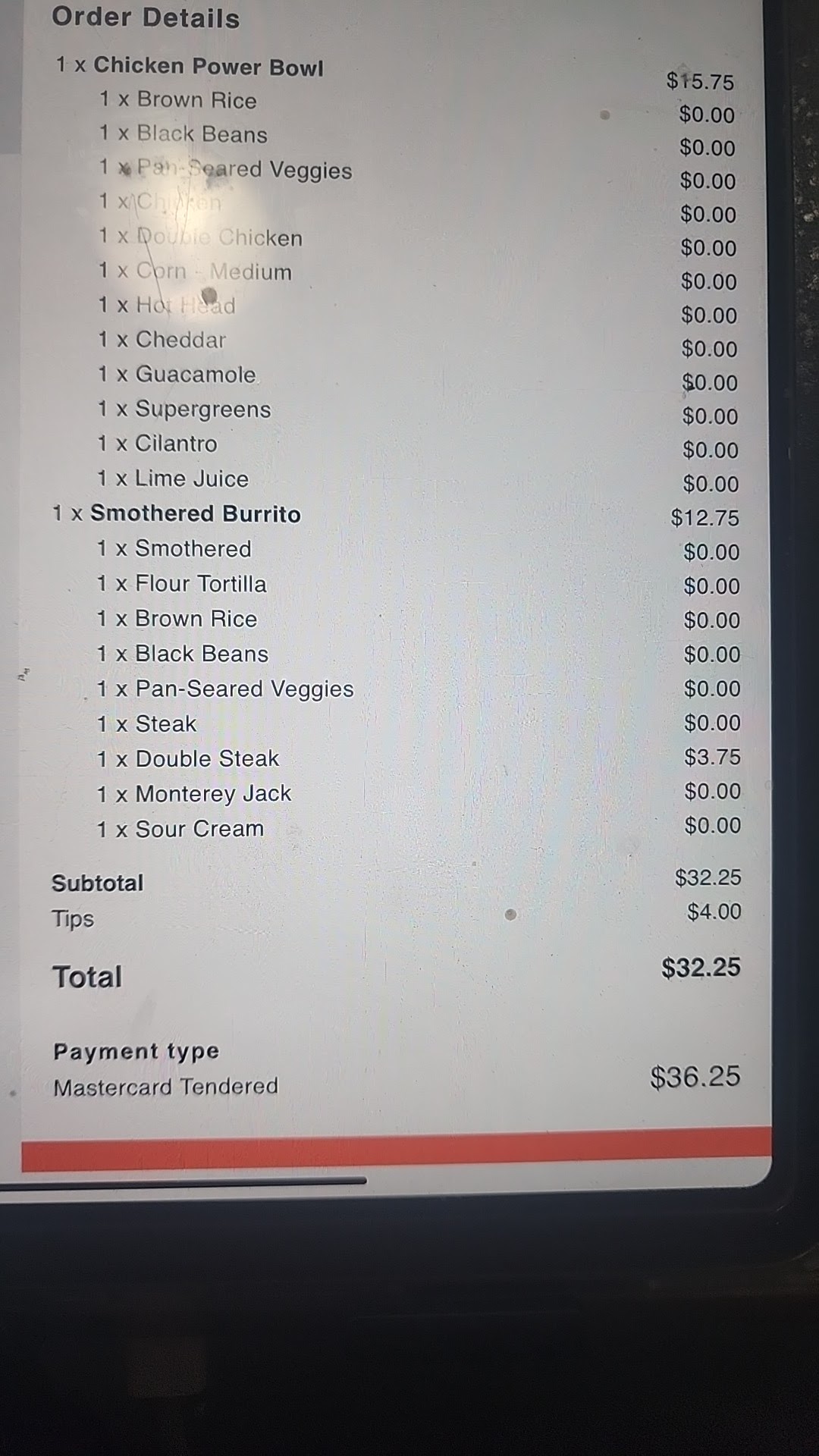 Read moreToday was my first time, and I left without food. I walked in cheerful and with a smile. The young kids working there all had frowns on their faces. I asked a question, and they all stared silently back at me with no answer. Finally, I approached the young man, making the burritos. I repeated my question to him, and he answered politely. He was the only one with a smile. I explained to him that I am a trucker and that I could only eat half the burrito and did not want my burrito exploding open. I asked if I could have two tortillas, and I would gladly pay for the second tortilla, but only half the stuffing for one burrito into each tortilla. He told me that could be done. Especially because I was willing to pay for the second tortilla and tip for the inconvenience of the workers. I got all the way down to the end and was ready to pay. The young boy who was frowning told me that he had to charge me for two burritos. I explained what I did. Even the young boy who made my burrito explained that I only had half the stuffing in each tortilla. The young man trying to double charge me argued with me. I told him that I had no problem paying for the extra tortilla. He continued to argue with me and told me he had no choice. He was not reasonable at all. If I wanted to pay for two burritos. I would have paid to have a bowl and the tortillas on the side. I will never experience this place because I will never give my business to it. They hire ungrateful, nasty young people who have no idea how the service industry works. I have worked in the service industry. I worked in the service industry back in the day when you had to do it with a smile or you would lose your job. I did not expect tips for bad service.Like the kids do these days. I don't believe these young people should lose their job. But I believe they need training. I believe they need to understand that's the best way to get a good tip is to smile and be friendly and helpful. I recommend people stay away from this place. Chipolte has never tried to charge me double for doing the same thing.And although their staff does not smile very often. They are much friendlier...