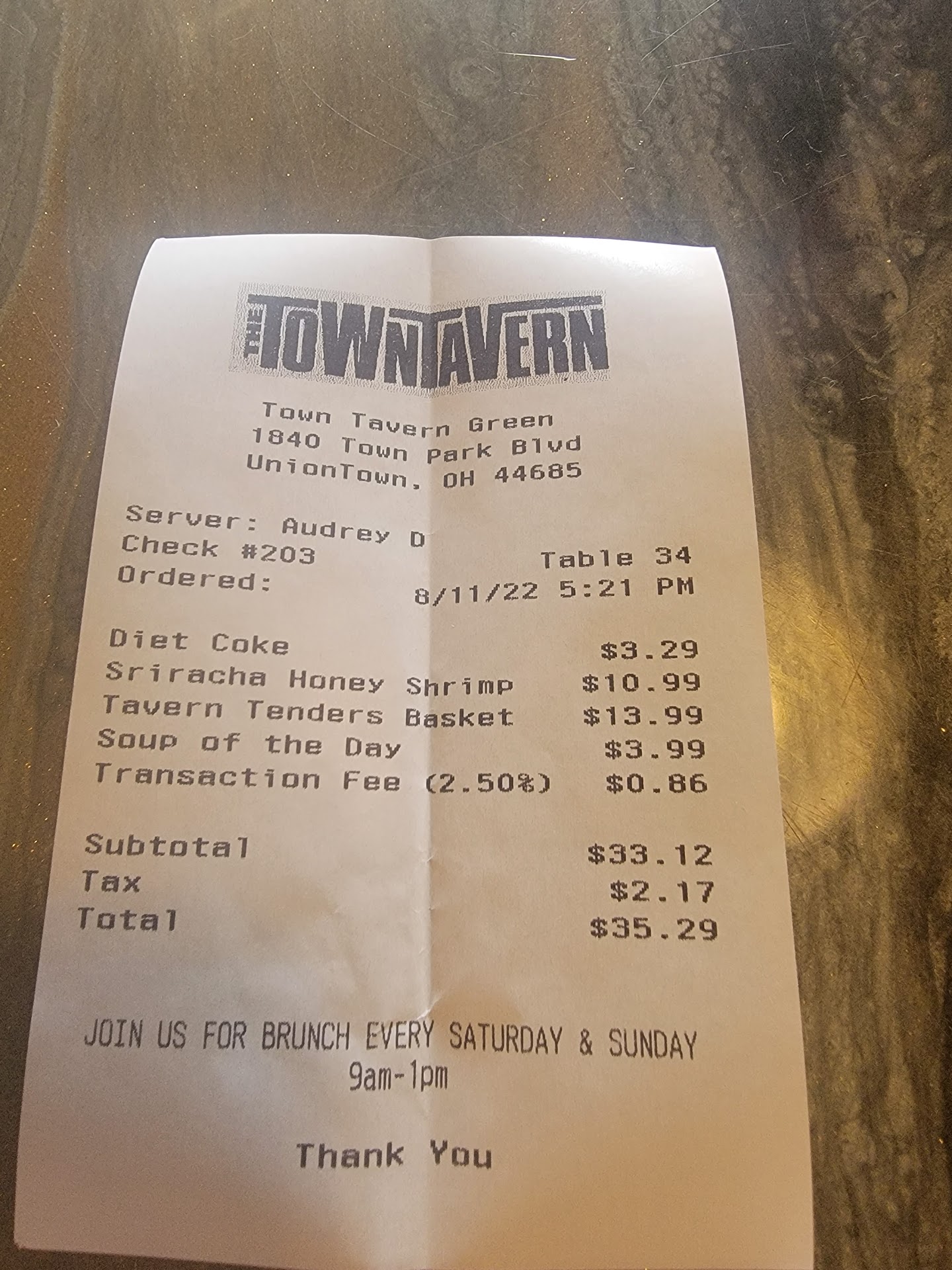Read moreIt was our first time dining at The Town Tavern. We were a part of 10 celebrating the birthdays of two of my adult sons. Since it was our first time there we weren't sure if they did anything like sing for birthdays but by the time we ordered we had seen waitresses carrying sparklers and singing and bringing out a dessert for several different tables so I decided to mention to our waitress that we had two birthdays at our table. We proceeded to eat and all our meals were pretty good. Our waitress was also attentive and friendly. However near the end of our meal she asked if we needed boxes and would like any dessert. I mentioned the birthdays again and she told me that they don't really do anything for birthdays then hesitated and seemed to stumble over what to say then she asked for their names. We waited around for awhile and she asked again what their names were. By this time we were done eating and she'd started clearing plates. Eventually she came back with a couple other waiters and they sang a half hearted happy birthday with no sparklers or dessert. We don't expect free stuff and that's fine but after seeing several other groups receive nice birthday celebrations then to be told a very obvious lie like I was stupid was quite off putting. If there was some issue that I didn't bring it up early enough or they didn't believe me about the birthdays then they could've explained further or asked me and we would have shown IDs but to be lied to like that to my face put a bit of a damper on the evening so I'm not sure we'll be going back. Someone at our table even had a video from a previous visit showing what they do for birthdays so I don't understand why a waitress...