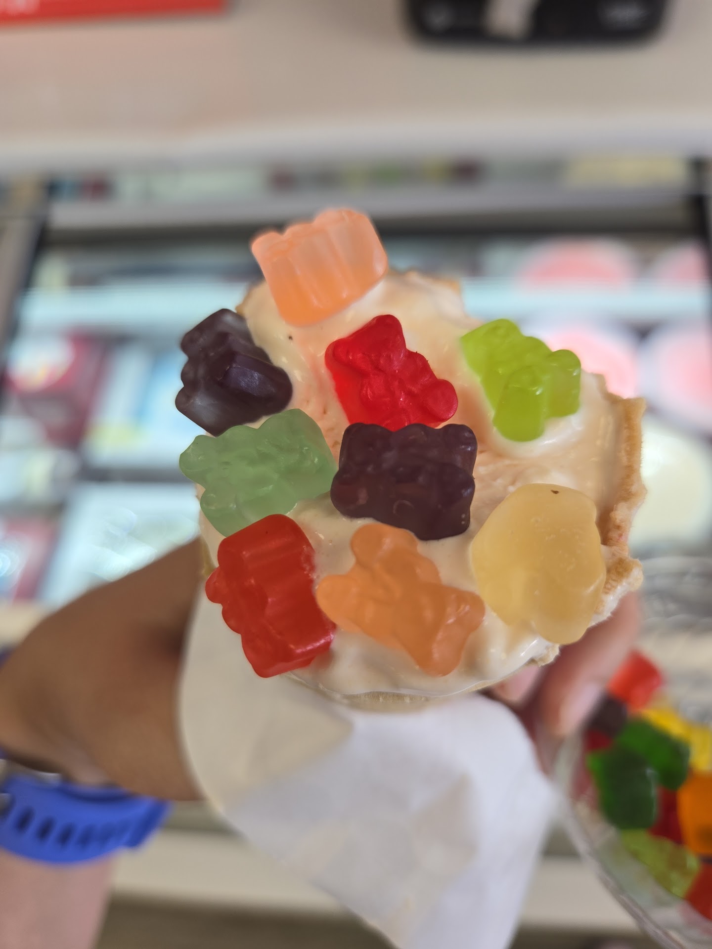 Scoop of Mint Chocolate Chip - kids loved it New Orange Cicle Waffle cone - gross texture. Felt like whipped cream. We threw it out and wasted $6 :( Side of mini Gummy bears - delicious