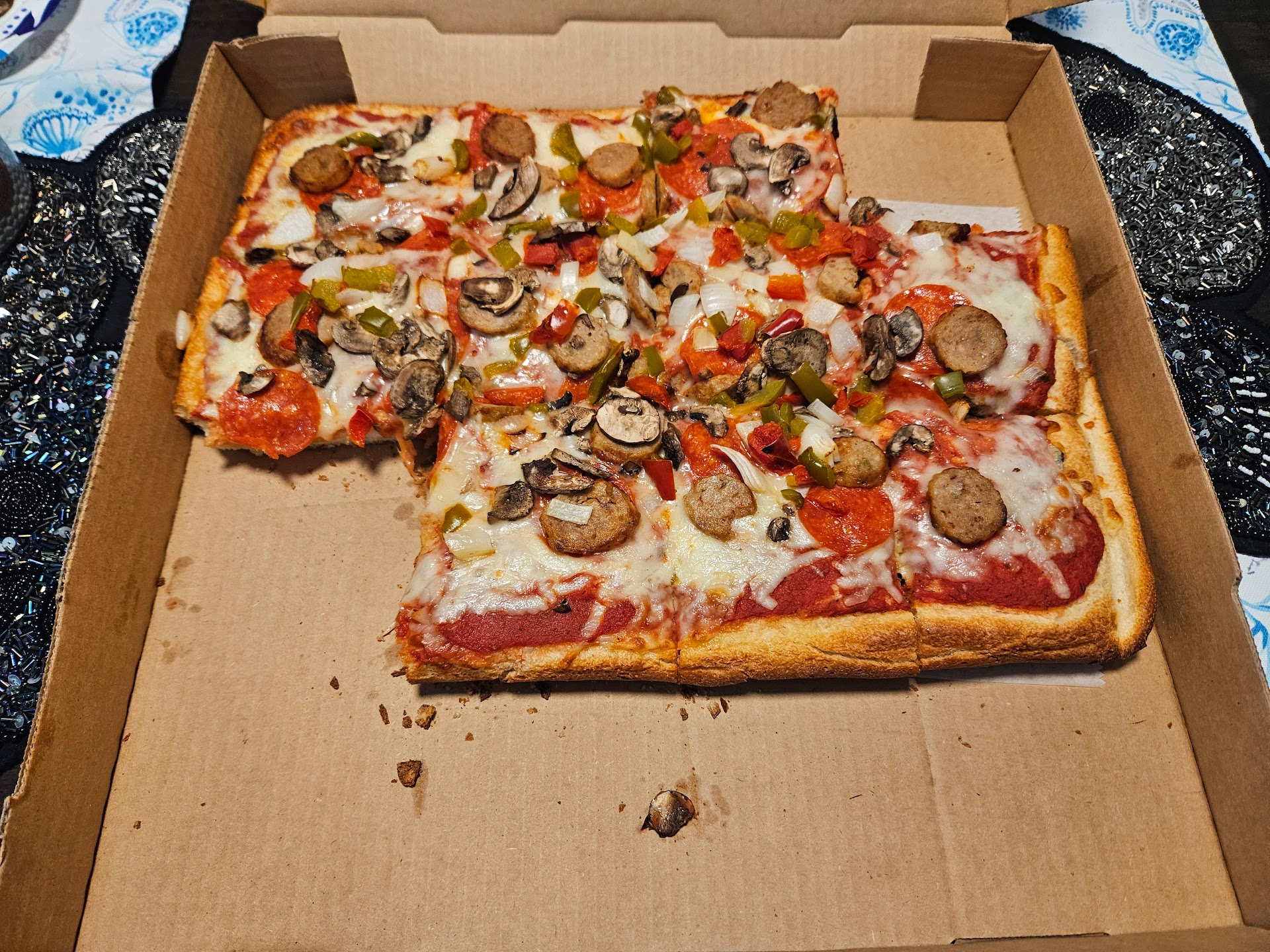 Read moreFirst time ordering from here, from a friends recommendation. We got a House Special Sicilian. Crust was a little overcooked, compared to places I normally go to, so a lot of chewing. Most of the vegetables on top of the pizza were undercooked, and the ones on the edge were slightly cooked. I was surprised that the pizza was 16x12. All the local places I normally visit are 16x16. Their site only says 16" when ordering a Scilian, and Scilians could be square or rectangular, but a customer would assume it would be square 16x16 because their picture on Google Reviews shows a square one which looks amazing. All in all, it wasn't too bad. It's definitely a place worth stopping by if you're on the go or grabbing a slice, but for the price I paid, I'll probably stick to a place I know. I will definitely order again from here since this was just my first time, but maybe I'll try a regular pizza. When I do, I'll update my review...