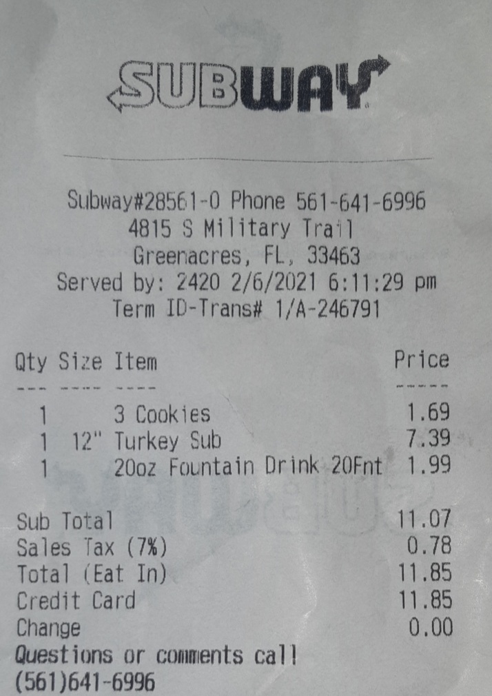 Read moreSo I went there against my better judgement and I was disappointed. The service was great but a mistake was made and I had to pay for it. I order the 6" turkey sub meal and paid $11.85. When I check the receipt I noticed that I was charged for a footlong sub, 3 cookies, and the fountain drink. I'm not sure how your register works but I'm sure my last visit at a subway I was able to substitute the chips for a cookie and the drink was not $2.00 for a small. I feel like I've been robbed, this better be the best subway...