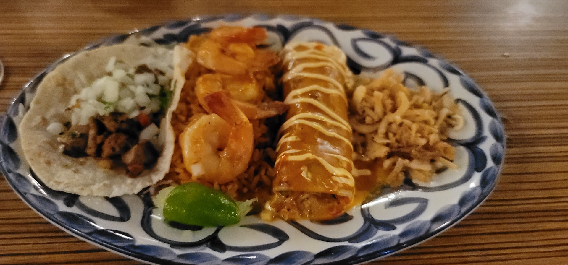The lady (our server) took our order and we had to wait around 25 more minutes for the food, my mom ordered green enchiladas I believe, but they brought a different dish with other king of enchiladas (that was the first plate), we was waiting for the rest of the food for about 10-15 more mins, finally the food was arriving but they brought 2 more plates (steak and shrimps) for my dad and brother, they asked for medium cook steak but it was very dry and well done.