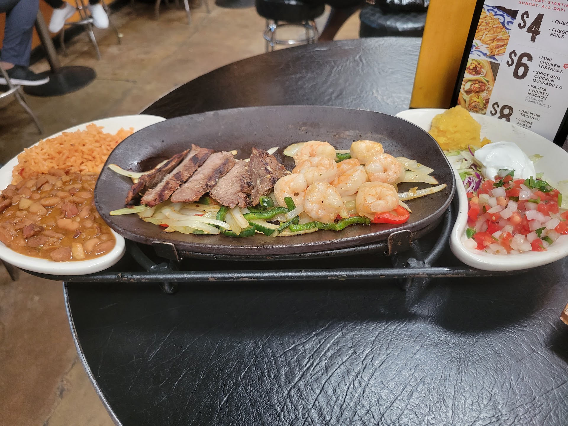 I called the manager 3 times with 3 different servers and finally the manager showed up with a smell of weed, I kindly explained what happened with all the mistakes and I told him that my wife and I were waiting for our food and he told me that he will make our food very special. We ordered fajitas with steak and shrimps, after 15 minutes waiting the food arrive with steak and pulled pork wow, this was too much for me and I called the manager again to ask him what’s happened and he told me that they don’t have enough people working and the server (the lady) is a new worker with no experience at all. The lady was in front of us and was just about to cry.