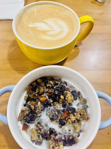 The inside is really beautiful with the color scheme, and exposed brick. very comfortable. Plenty of seating. They have a couch so that's a plus! There is a large sense of community here..so many vendor items to purchase. Jewelery, baked goods, knitted items, etc. I love that. It seemed to be LGBTQ+ friendly they also have gender neutral bathrooms. Not that I mind or care..but they were playing Christian music the entire time we were in there..which would deter me from dining in more often than not if that was the constant music choice. Just my personal opinion and some added info. We didn't try any food, but it did smell and look pretty good. I'd say if You're looking for a decent espresso/iced coffee try somewhere else..but definitely stop and check out the vendor...