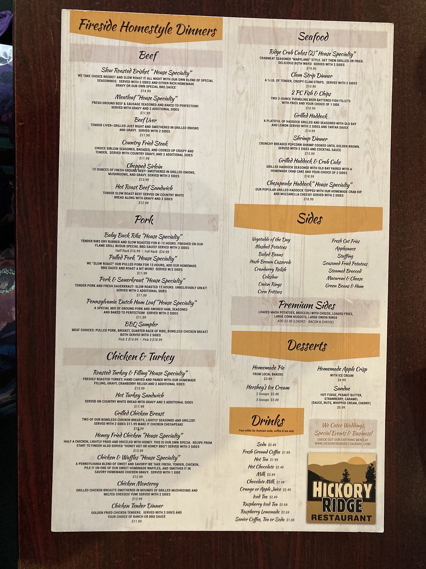 My mother and I live near Gettysburg Pa and made the trip to this resturant on a whim after a Yelp! Heads up. We spent a good 30 minutes deciding where to have our annual mother daughter meal. ( since my 3 young girls usually go everywhere with us) I must say, we were both impressed Upon arrival we were seated at a table next to the 'fireplace' The setting was comfy-cozy & country with primitive decore. We were quickly handed menus and asked what we would care to drink. Then our sever, Mary Lou ( who is amazing) took our orders and returned with homemade buttery biscuits and fresh apple butter -yum :) Mom and I both ordered homemade coleslaw ( very creamy, chunky, sweet) she even let us sample before ordering. My mother and I both ordered the beef brisket. Mom enjoyed a bowl of clam chowder and in no time our food arrived. The beef was pretty tender, it came in long thick slices (about 4 decent sized pieces). The mashed potatos, although abit thick had a great taste and were also good. The corn on the cobb was ok, but not the greatest probably since it is currently out of season and the corn was not the typical frozen half cobb you get most places. Mom said her broccoli was on parr. I had planned to order a dessert, but we left WAY too full. Thanks so much for a truely unforgetable, awesome experience. We will definately be back. This is my new favorite resturant. You do not have to ask for a refill or extra napkins . The waitress really made the experience worth every penny and then some. Also, the food is...