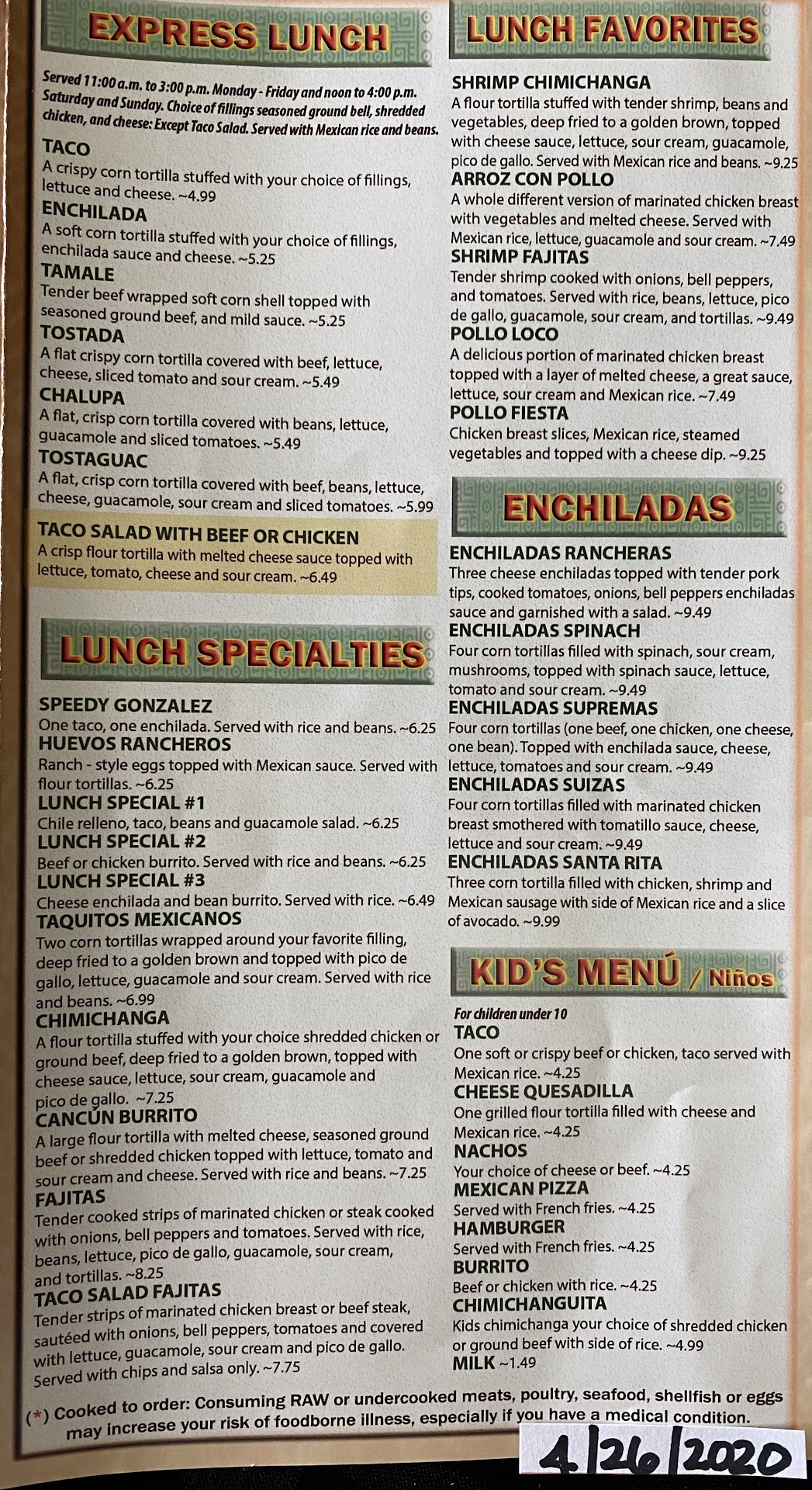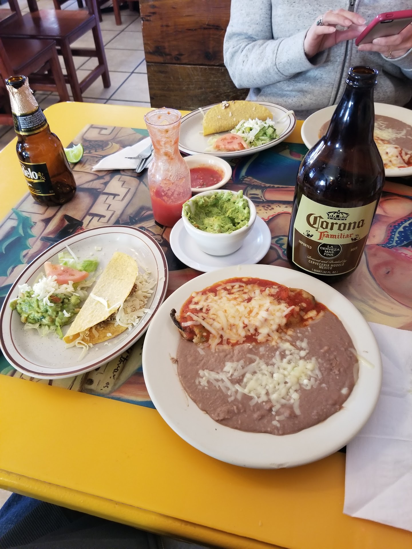I recommend "Lunch Special #1" which is a chili relleno, a hard shell taco, refried beans and guacamole salad. Combined with the free chips and salsa when you sit down and an ice cold cervesa. You'll be so happy to have...