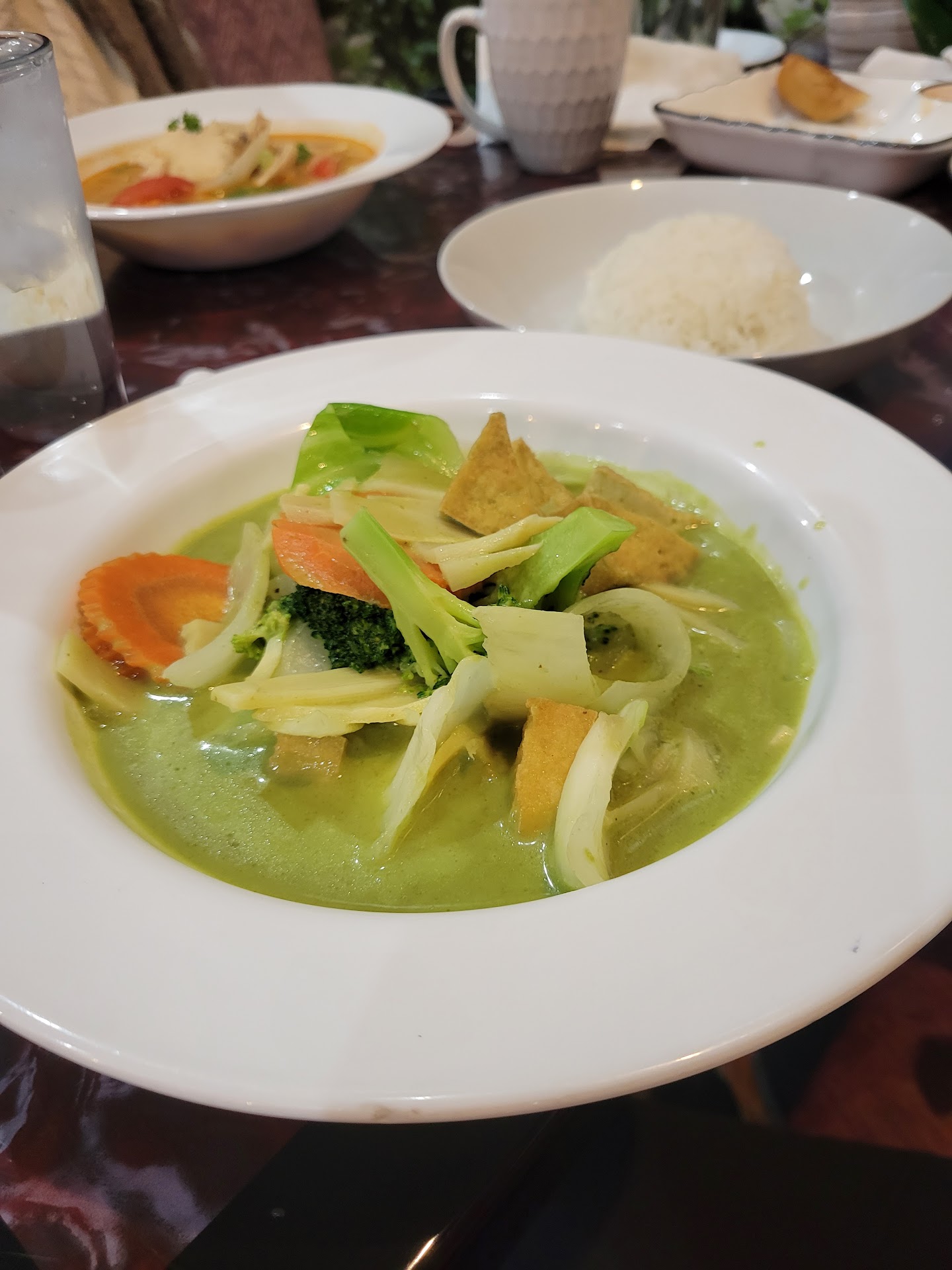 Ā Ā Ā Read moreGuys... this Thai food is no joke! I have had it once before as take out but decided to dine in this time. Very clean. I had the Thai Coffee (comes iced). Thai coffee now has a special place in my heart. 10/10 We also ordered the ginger tea. Also delicious! For an appetizer we had the spring rolls. Definitely not frozen - with that crunch it had to be made in house. The sauce paired with it was great. For entree we had the green curry (tofu option)(curry was way more green than I'm used to seeing but it was delicious) and TomYum soup (chicken option)(also great). Everything was delicious and the portions were big enough to serve as another meal later (maybe even two) The total was $42: 2 speciality drinks, an appetizer, 2 large entrees. The value matched the price in my opinion Great service. Friendly staff. Definitely...