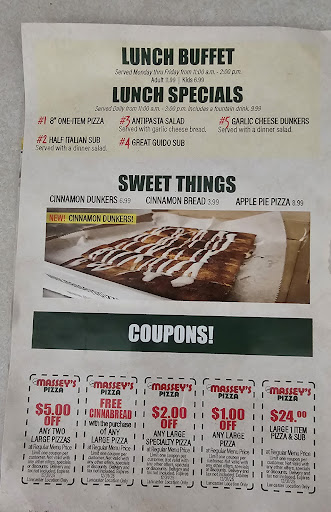 Read moreI’ve been here twice. Once for the lunch buffet and once with a party of about 15 people. This Massey’s didn’t disappoint. The lunch buffet always had pizza on it when I was there. This location was very clean both times I was there. The staff was very nice and accommodating to our group when we met there. This location has a nice bar, plenty of TV’s for sports and Keno if you are into that. Plus they have a couple old school arcade games and pinball machine. I would return to this Massey’s and...