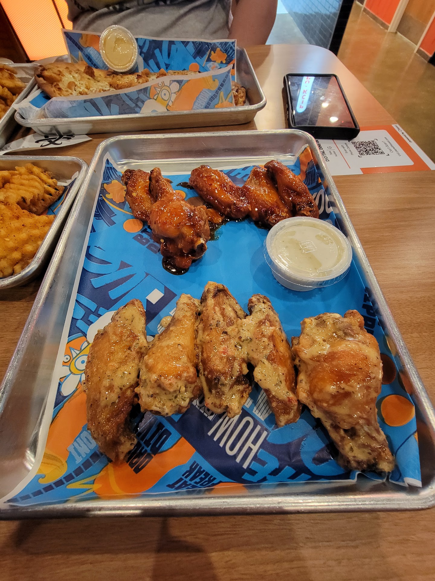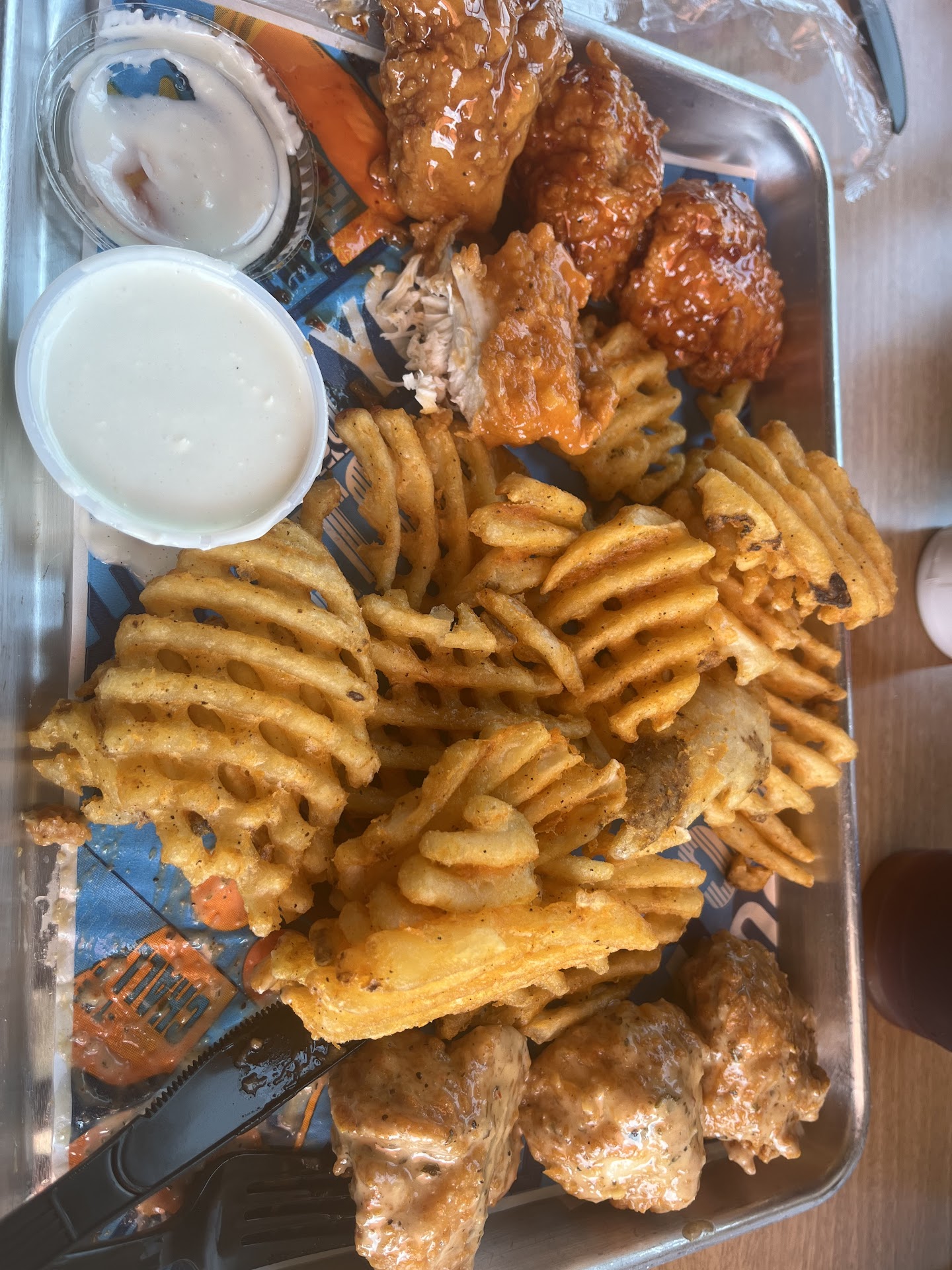 Ā Ā Ā Read moreMy honest review....I was excited to tryout the new wings place. I know just opening up they would be busy so I opted to order online the minute they opened for lunch. Online ordering was a breeze, very easy to do. I ordered a 5c traditional wing all flats with ranch and bbq jerk on the side, order of waffle fries with aioli and an order of fried Oreos for 19.18. My husband went to pick it up for me..he said the staff was super nice and the place was super clean. I always order wings naked at places and dips on the side. That being said the wings weren't seasoned at all with nothing..no salt no pepper ..nothing. They were nice and crispy but dry. The ranch was very good and the jerk bbq was outstanding just the right amount of jerk seasoning ratio to bbq sauce. I ordered waffle fries with their Aioli. I got waffle fries no Aioli. The waffle fries were soggy and again no seasoning to them at all...no salt...no nothing. The fried Oreos we very good.. can't really mess up a fried Oreos unless you fry it in old grease and that wasn't the case at all. Overall I wasn't impressed with the food...it was edible at best. But they did provide wet naps which another reviewer said would be nice if they did so I'm glad they are listening to reviews. Would I go back....maybe to try the boneless or strips at some point but I would eat in there instead of ordering online.