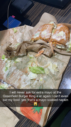 Read moreI normally don’t go to Burger King in greenfield because the customer service is bad but recently I went first time same service but the food was great this time the service was great but the food wasn’t i ordered a whopper added cheese and extra mayo well the put so much mayo it was inedible I couldn’t eat it even after I tried remove the excess mayo it was like they put a cup of mayo i tried to coke it down because it was my lunch fur work I will never go back to this Burger King again and I live in greenfield .so disappointed what a waste of money .oh and they always have me drive forward then back so they don’t get in trouble for taking too long. Do better...