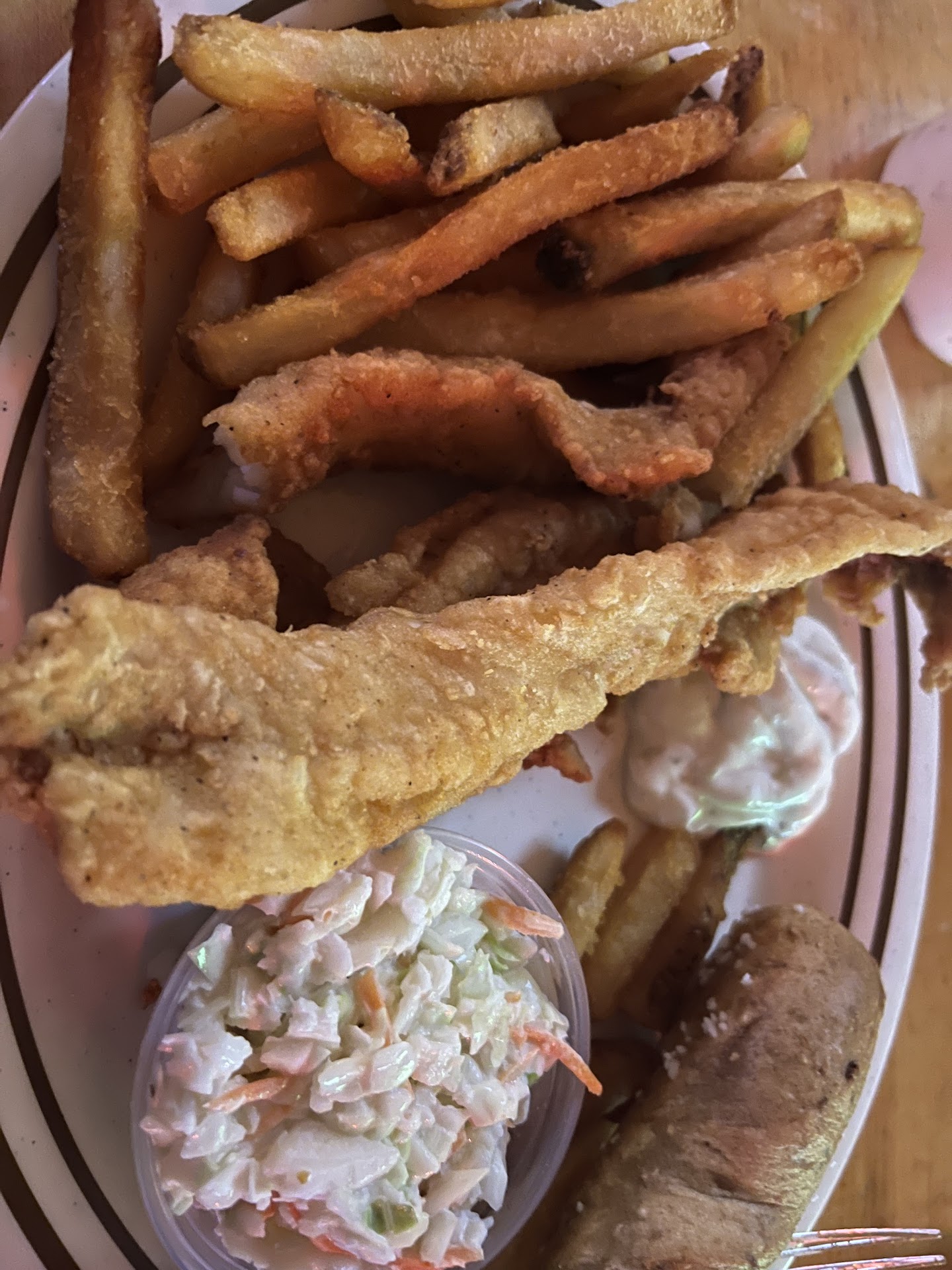 Read moreWent for a fish fry (3 adults 1 toddler) Place was not busy several people at the bar and maybe 3/4 tables of ppl including us. Waitress came over we started with water to drink which took a while to get to us . Ordered clam chowder , all you can eat fish , 2 piece cod dinner, shrimp dinner and pretzel bits for the little one. The soup was bad so salty and barely any bits of clam very thin almost watery. Both fish dinners were ok , my shrimp was soso waitress did not give me cocktail sauce , took more than 10 minutes to get her attention, she came to our table and says I'm busy I'm by myself even before she knew what I wanted . She brought back cocktail sauce but now my shrimp was cold . The coleslaw tasted like it was going bad and did not look fresh was not eaten. I had to get up twice and go to the bar to get water . The waitress never smiled and when she was told about the coleslaw just said I will tell the chef never said sorry or try to make it right . Having a waitress that seems like she hates her job just makes you uncomfortable, like you are bothering her to do her job. Don't think I...
