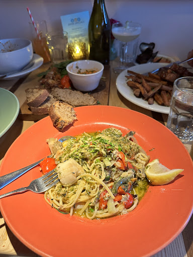 Decent food, but definitely way too expensive for what it is. If you’re in Greenfield it’s a reasonable option but if you can drive, nearby expensive restaurants like the Blue Heron offer the same, if not better, food for essentially the same cost. Here’s what we ordered, and what we thought of it: The Seafood Scampi has “scallops, shrimp and crab meat” and when it says scallops, they mean the bare minimum number of them to be able to list scallops as plural, i.e. two. My friend and I both ordered it and counted to confirm we both got two scallops, three shrimp, and some heavily diffused, presumably originally canned, crab meat. I understand restaurants need to inflate costs for dishes to stay in business but in this economy, that amount of seafood for a dish that costs 26 dollars is ridiculous. As my boyfriend joked, “Seafood Scampi, more like Seafood Skimpy!” The pork chops were good, nicely cooked and smoky, albeit maybe a little tough. The “Catalan board” (as someone who actually lived there and speaks Catalan, I can promise you it is not really all that Catalan) was creative with the use of fried manchego, but the romesco itself was pretty bland. The mussels were well cooked. The tomato sauce it was cooked in was flavorful but a bit overpowering and made the mussels mostly taste like a tomato soup. It comes with one piece of toast, and when my friend asked for more for dipping into the remaining sauce, we later saw that we were charged a dollar per slice.