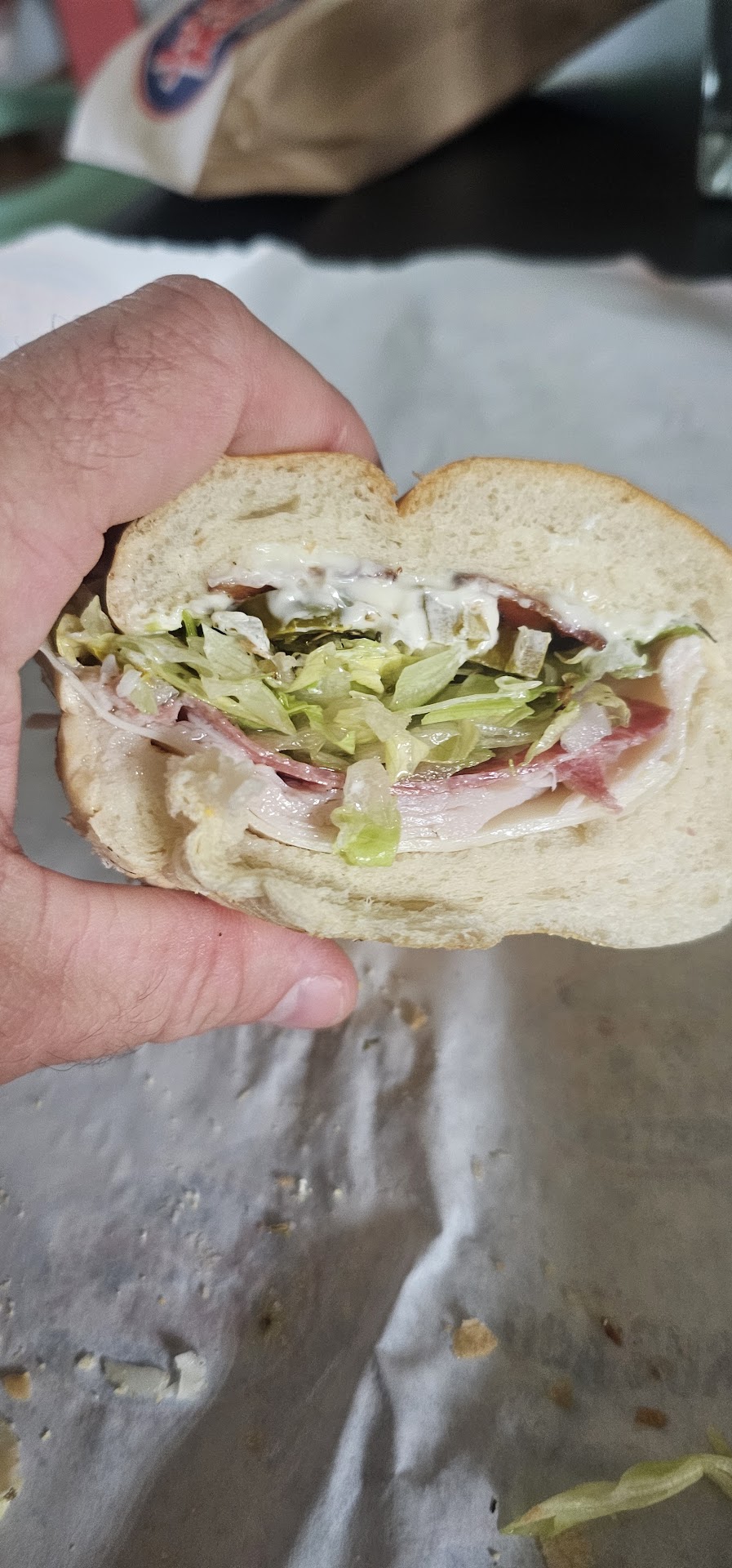 Read moreHeard so many good things from a co worker about how Jersey Mikes subs were the bomb. I came in guy behind counter said hello i said hows it going he coughed n said hello can i help u like some stranger walked in his house so i said hello loudly back like he was hearing impaired to make sure he heard me. I ordered my sub he starts making my sandwich he pulls out this raw par baked looking piece of bread ive been a baker for 21yrs it was raw i asked if he had a darker one he said they are all like that ok he cuts fresh cold cuts ok thats nice than he piled lettuce on it like ive never saw before (when i left i threw most of it out.) He put two tiny end cuts from tomato a hand full of onion (also most of which i tossed) pours the oil n balsamic all over it and counter with all ingredients that didnt make it on sub. Than puts sub on paper n proceeds to pick n sort all lettuce and onion from eachother n put it back in bins. Dude it had oil on it and came in contact with meat thats a no no cross contamination. Checked out I took sub tossed hefty amount of lettuce n onion out rewrapped it n left took bite in car yep i cant eat this how it is bread was so gummy it stuck to my teeth raw dough went to store bought new sub bun reassembled sandwich it tasted good but i coulda made my own sandwich without that running around. I might try a Jersey Mikes again but not this...